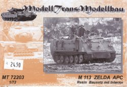 Special Note: I received an email from Jorit Wintjes, who runs the outstanding website: Pedestrian Guide to IDF Braille Scale Modelling, and he has informed me of the fact this these M113 kits are incorrectly named. Apparently, Modell Trans (and I) incorrectly assumed that all M113s used by the IDF are called "Zelda", when in fact, only the versions with the stand-off armor are called Zelda. The first two kits in the Modell Trans series, 72203 (this one) and 72204 (Command Version) are actually just M113s (sometimes called Bardelass). Only kit # 72205 is actually a Zelda, and it should correctly be called a Zelda I (Zelda II has improved armor). Thanks very much for the correction, Jorit.