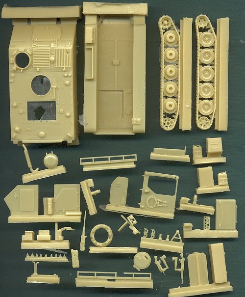 The parts are up to Modell Trans' high molding and casting standards, with very few blemishes or air bubbles. The most obvious flaws are a couple of sinkmarks in some of the interior parts, copied from the originals. The hull and chassis are heavily modified and improved from the ESCI parts. All hatches are open, and the interior is detailed, except for the engine compartment. The wheels have been greatly improved, with accurate pairs of wheels, and guide teeth on the tracks. The .50cal MG is fantastic, as are the 7.76mm FN MGs (I think that's what they are).