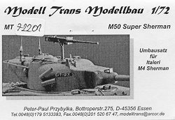 The set includes a complete turret with appropriate modifications; the main gun (slightly warped, but should be easy to fix); .50cal machinegun (improved somewhat from the ESCI gun); and a new engine deck. A commander's hatch is included for the cupola, but the loader's hatch is required from the doner kit. Smoke genade launchers are also included. As typical of this company, the resin is very high quality, with only very minor flash, and the only air bubble I've found is on the very tip of the muzzle brake. Although specifically designed for the M4A1 kit, I'm fairly certain that this turret could also be used on an M4A3, as well as other Sherman variants, such as M4A2 or M4A4 (only available from MR Models at this time). Note that ModellTrans also has released two complete kits of the M50, the M50 HVSS (Israeli), and M50 HVSS (Chile). |