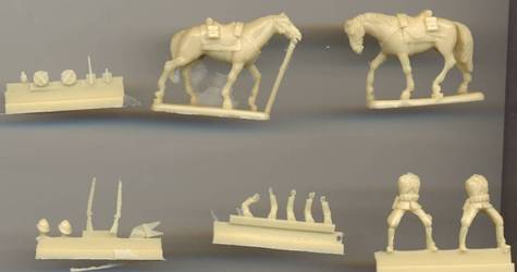 with a bread bag, map holder and (as separate parts) a canteen, a collapsable bucket for the horse, spade with bayonet and rifles. As you can also see in the pictures, the shaft of one of the spades was broken and lost to the carpet monster. Replacing that with some sprue will not be too big a challenge. Painting and correctly adding all the