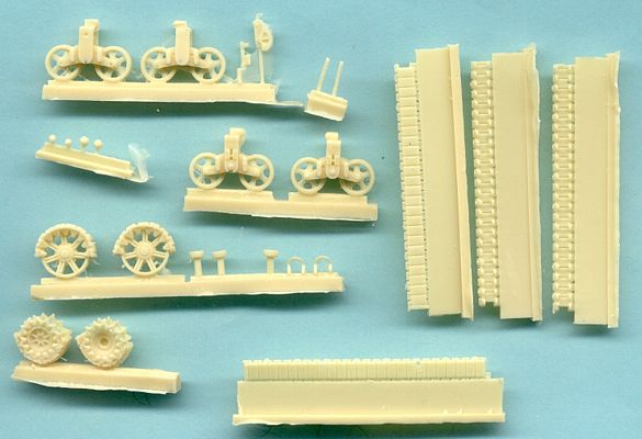 The suspension parts are well molded with the track links molded around the idler and sprocket wheels. The parts do not look like they will be difficult to cut off from their pour plugs. At middle left is a small pour plug with the headlights and tail lights. Below with the idler wheels are three of the four return rollers and two U-shaped parts that look like headlight brush guards like we see on the box art. At top center are the two machine gun barrels for the sponsons but my kit appears to be missing the coaxial and the bow mounted machine gun barrels. The four lengths of track is the flat rubber block type with end connectors similar to the T41 or T51 track used on the Sherman. |