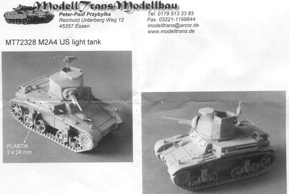 This is a review of an American light tank developed in the late 1930s and is the precursor to the M3 and M5 Light Tank series. It served mainly as a training tank for the US Army and did see combat on Guadalcanal in 1942. Several M2A4 tanks were also used by the British for training. For those modelers making a collection of M3 light tanks you should have this model. The model comes in a clear plastic box with artwork showing the vehicle profile and some markings of a yellow stripe around the turret and star and a unit marking. The lineage with the M3 Light is obvious and with notable differences in the M2A4 having seven small view ports (pistol ports) around the turret and a different idler wheel. The turret is similar to the octagonal, riveted turret of the initial product M3 though the 37-mm gun barrel has a different recoil mechanism and construction. The