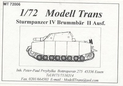 This conversion set is designed for the Hasegawa Pz IV. It was made by grafting the upper hull casement of the ESCI Brummbar kit onto the upper hull of a Hasegawa Pz IV kit. By doing this, accurate fit to the rest of the Hasegawa kit parts is assured. The detail is very nice, thanks to the good detail on the original kits. Unfortunately, this does not eliminate the major weaknesses of the Hasegawa Pz IV kits, those being the awful tracks, and the smooth fenders. The set contains the new hull, armored side skirts (also copied from the ESCI Brummbar kit), the main gun, and several small pieces, which I assume are mounting brackets. No instructions or decals are included. I do not know if this set will fit the lower hull of the Revell Pz IV, but it would be nice if it did. |