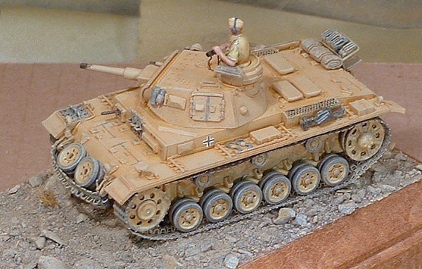 This is MR Model's resin and white metal conversion to back date Revell's Panzer III M or J to the "G" version. In fact, you don't end up using much of the Revell kit - mostly just the lower hull tracks, and bogey wheels. The resin parts of the kit consist of a new upper hull, with revised rear deck and headlight fittings on the front fenders, a new turret with side view ports and the lower cupola extended out at the rear, gun mantlet, early style twin mufflers, a rear engine vent, rear hull plate and rear fenders. The resin parts are extremely well moulded, particularly the headlight fittings. I really wish that MR had not moulded on the tools although they are nicely done - I would have preferred to arrange them myself. In white metal, MR provides the early style drive wheel and idler, side hull hatches (these were not included in the Revell "M" kit), a smoke candle box, split hatches with nice interior detail, a fire extinguisher, notek driving lights, a shaded headlight, two regular headlights, two reinforced early style shackle brackets for the glacis, and a turned aluminum short 5cm Kw.K.38 L/42 gun barrel. By the way, thats my fake "hold and fold" tool in the background. It came in handy for bending the tracks. While the Revell Panzer III tracks are quite nice, I chose to replace them with the Part etched brass set. These look a little thin perhaps (I'm not certain if this is a legitimate complaint or if they just seem thin against other 1/72nd scale track sets) but have excellent detail, including open guide horns. The Part tracks fold together very easily, although you have to be careful that the tops of the guide horns don't have a visible seam. I used a dot of super glue on each guide horn, followed by a quick sanding with a file, to make them look solid. In an earlier project (MR Model's Befhelspanzer IIIK) I ran into the problem of the etched brass tracks not conforming tightly enough to the toothed drive wheels. For the "G", therefore, I removed most of the teeth where the track would come into contact, leaving just the nubs. This allowed the track to "sit down" properly. I began by assembling the Revell lower hull and bogies. I used the white metal hull side hatches (I was using the Panzer IIIJ as the base) in place of the plastic ones because they seemed more detailed. I then assembled and attached the white metal idler wheels, after reducing the length of the mounting post a bit (I found it was too long and would have made the tracks crooked). I then assembled the etched brass tracks and formed them around the drive wheel. You really don't want to do this with the drive wheels glued in place - they'll snap off causing serious frustration. I bent the tracks, then glued them to the drive wheel, then mounted the whole, ensuring that the tracks lined up with the plastic bogies and return wheels. The kit requires two lengths of etched brass track, one considerable shorter than the other. The brass holds the sag quite nicely. With the lower assembly complete I painted it - Modelmasters Acrylic #79 RLM Sandbraun (a Luftwaffe colour, I know) and several thin coats of grey, rust and tan/brown for the tracks. I had decided to do this kit in Deutches Afrika Korps (DAK) colours, so I went out to purchase a suitable pot of paint. Totally by accident, I picked up the RLM Sandbraun instead of Sandgelb which I was looking for. In fact, I didn't even notice my error until I had put the first coat on the lower hull. While the colour was obviously too orange looking, I though it would come out okay once I had done some pin washes in brown and then dusted it with tan. At the end of the project, it still looks a little bit too orange in places to my eye, but not bad overall. Preparing the upper hull entailed a few problems. The pour block for the upper hull piece is at the rear and extends downwards on an angle. The problem is that that area is where you have to mount the resin piece with the engine vent (on its underside). The piece with the engine vent on its underside also forms part of the upper rear deck so the upper hull piece, where the pour block has to be removed, has to be completely flat to receive it without a gap. This requires really careful filing to get it right. I also had to file the edges where the sides of the upper hull meet the sides of the lower hull, in order to get a good fit on the glacis. The rest of the kit fit together without any problems. The instructions suggest cutting the ring below the turret from the Revell kit and gluing it to the bottom of the resin replacement turret. At first I wasn't going to do this, but I think it actually helps to position the turret correctly. I added a rack for jerry cans on the rear deck, as well as some other miscellaneous gear. The figure is from Migs Afrika Korps set. The base is done with rock dust left over from a building (a new front porch on the family cottage) project last summer. I just glued the finer stuff to the base and added some small stones. AMPS East 2004 I managed to get this kit done in time for AMPS East 2004 held in New York State last September. For those of you who aren't familiar with AMPS (Armor Modeling and Preservation Society), the organization has developed and uses a very detailed judging system. Unlike most competitions, pieces are judged not against each other (i.e. 1st, 2nd, 3rd) but against a fixed set of criteria (and are awarded a gold, silver or bronze). They judge only your work, not how it stacks up against other models on the table. These criteria are available on the AMPS site (http://www.amps-armor.org/contestRules.asp). A really great feature of this judging approach is that not only do the judges (usually a team of four or five) take a good amount of time examining your work, but they also provide written comments sheets indicating the score you received in the three major criteria categories (9 sub categories) and why. These are necessarily brief (i.e. seam lines on engine deck, deca