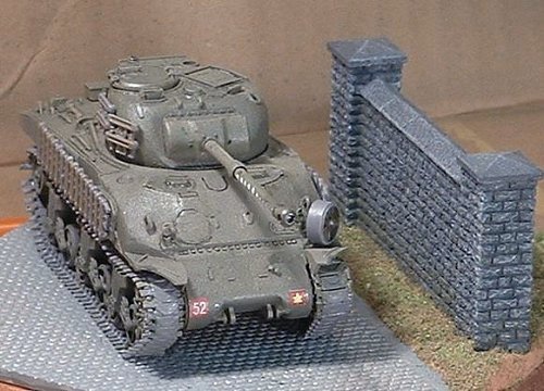 The vehicle I had chosen to model also had extra armour added in the form of Churchill tracks welded to the hull and turret. For the most part, I used the ESCI Churchill hard styrene tracks to represent this feature on both hull and turret. Unfortunately, on the front glacis it is clear from the photo that one of the lengths of track was welded on upside down (i.e. cleat side up). The ESCI tracks have no detail on the inner side, so I couldn't use them. Instead, I used a set of soft plastic Churchill tracks (possibly from the Matchbox or Airfix kit), which had a general approximation of the inner side. The additional track was painted a medium grey colour, then dry brushed with a rust/medium brown colour, as was the Sherman track. In the photo the crew has obviously painted the long 17-pounder barrel with a disruptive pattern. I hand painted this on the aluminium barrel provided by MR Models. I then air brushed the model with a light tan colour. This highlighted high wear areas and brought out the fine texture of the cast areas of the tank. Next, I added extra gear, including the spare bogey wheel on the port front fender, an antenna, the two tanker helmets that can be seen in the photo, and a selection of boxes and stuff on the rear deck. The 17-pounder shell boxes are produced by MR Models in a separate kit and the jerry can is from MarS of Poland. The shovel, which replaces the overly large ESCI version that comes with the M4A1 kit, is from the ESCI 25 pounder kit. I decided to portray it tossed on the rear deck rather than strapped into place on the side of the tank. After the extra gear was in place, I gloss coated the model and added the arm-of-service and divisional markings to the front glacis. These are from Aleran Decals. The AoS marking is visible in the photo beneath the Churchill track. The Divisional marking (5th Canadian Armoured) is not visible in the photo but I figured it was probably there just beneath the extra track. These are the only markings visible - there may be markings on the rear of the tank but my research indicated that these were not necessarily as common as front markings. The serial numbers on the sides would be covered by the additional Churchill tracks. I then dull-coated the model and applied a final light dusting of flat tan. The tracks also received a bit of work with a soft pencil to simulate the bare metal of the chevrons. The final step was to prepare a base with a cobble stone road (resin Custom Dioramics) and a wall (resin by Bayardi). I also used flocking, railroad turf, a mix of brown turf, yellow and green grass, around the wall. Heres the final product: AMPS 2004 This was one of the kits I took down to AMPS this year. For those of you who aren't familiar with AMPS (Armor Modeling and Preservation Society), the organization has developed and uses a very detailed judging system. Unlike most competitions, pieces are judged not against each other (i.e. 1st, 2nd, 3rd) but against a fixed set of criteria (and are awarded a gold, silver or bronze). They judge only your work, not how it stacks up against other models on the table. These criteria are available on the AMPS site. A really great feature of this judging approach is that not only do the judges (usually a team of four or five) take a good amount of time examining your work, but they also provide written comments sheets indicating the score you received in the three major criteria categories (9 sub categories) and why. These are necessarily brief (i.e. seam lines on engine deck, decals silvered on turret, etc.) but usually of great use to the modeller who wants to improve and do better on the next model. Heres how I did.