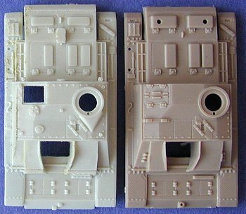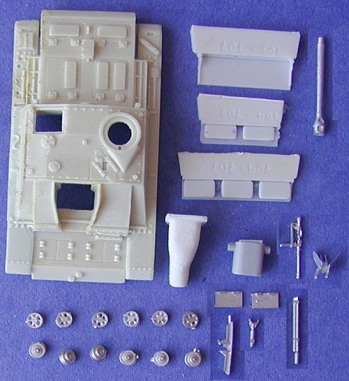 So you get a upper hull, late production, with cast deflector in front of commander cupola, open loaders hatches for the late version with Remote Control MG (also included), and a Topfblende (the correct designation for the Saukopf). Also in white metal, some early all-steel return rollers, to replace those horrible ones from the ESCI model, together with extra equipment.