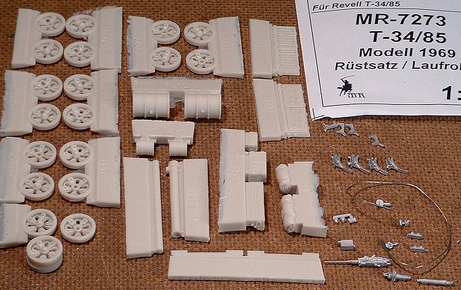 | Review by Dave Showell This conversion for Revell's T-34/85 fills the modern-world gap in the T-34 line-up. The career of the T-34 did not end with the conclusion of the second world war, but continued well into the cold war. As indicated in the title, this kit provides what you need to upgrade the Revell T-34 to the 1969 standard. It includes T-54 style "starfish" wheels, new stowage, a snorkeling tube, unditching beam, a new engine cover & an engine cover for snorkeling, smoke dischargers for the rear hull, large fuel drums and attachments for the rear hull, and so on. Interestingly enough, it also includes a very nice white metal .50 cal machine gun and two different pintle mounts.