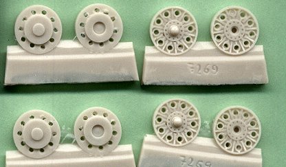 Enclosed are 20 light tan resin pieces to produce 10 roadwheels. Resin casting is superb. Clean-up of the parts from the pour plugs looks to be more difficult than the Model Trans T-34 steel wheels. These wheels can be used with the ESCI, Revell, AER and Eastern Express T-34 kits. Though listed for the Revell T-34-85 on the packaging they are in fact for the T-34-76 if all my references are correct. Though it is possible for a T-34-85 to have several of these all steel roadwheels as replacements. This wheel was developed due to a shortage of rubber in the USSR in the middle war period. These would be ideal for a 1942-1943 era T-34. A Stalingrad T-34-76 of late 1942 to early 1943 would have all-steel wheels. Most would have rubber rimmed roadwheels in the #1 and #5 stations to reduce vibration and provide a better ride. |