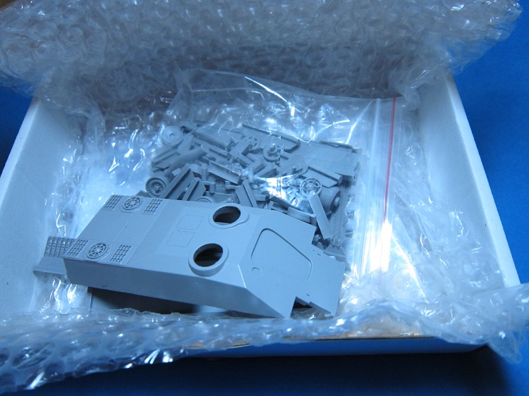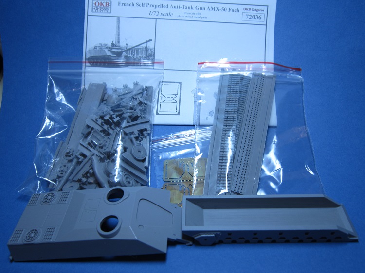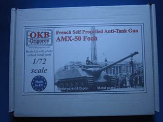 | History, Taken from Wikipedia... Based on the M4 chassis in 1950 a prototype was finished of a heavy tank destroyer in the form of a 120 mm self-propelled gun, the Canon Automoteur AMX 50 Foch, named after Marshal Ferdinand Foch. It was intended to give long range fire support to the medium AMX 50 "100 mm"; after the tank version itself was planned to be armed with a 120 mm gun, the Foch project was abandoned. This is a very popular tank for the World of Tanks game apparently. The model is quite straightforward and has some very nicely cast parts. There is very little flash and what there is can be easily removed with an old toothbrush, the casting blocks are easy to remove and clean up is very easy. What do you get? The box is the standard OKB-Grigorov white box with a printed label on the top... Inside the box... The instruction sheet... The hull castings... These are the main castings in the kit... The pieces fit together absolutely precisely... The bits bag emptied... The running gear, first the torsion bar arms...