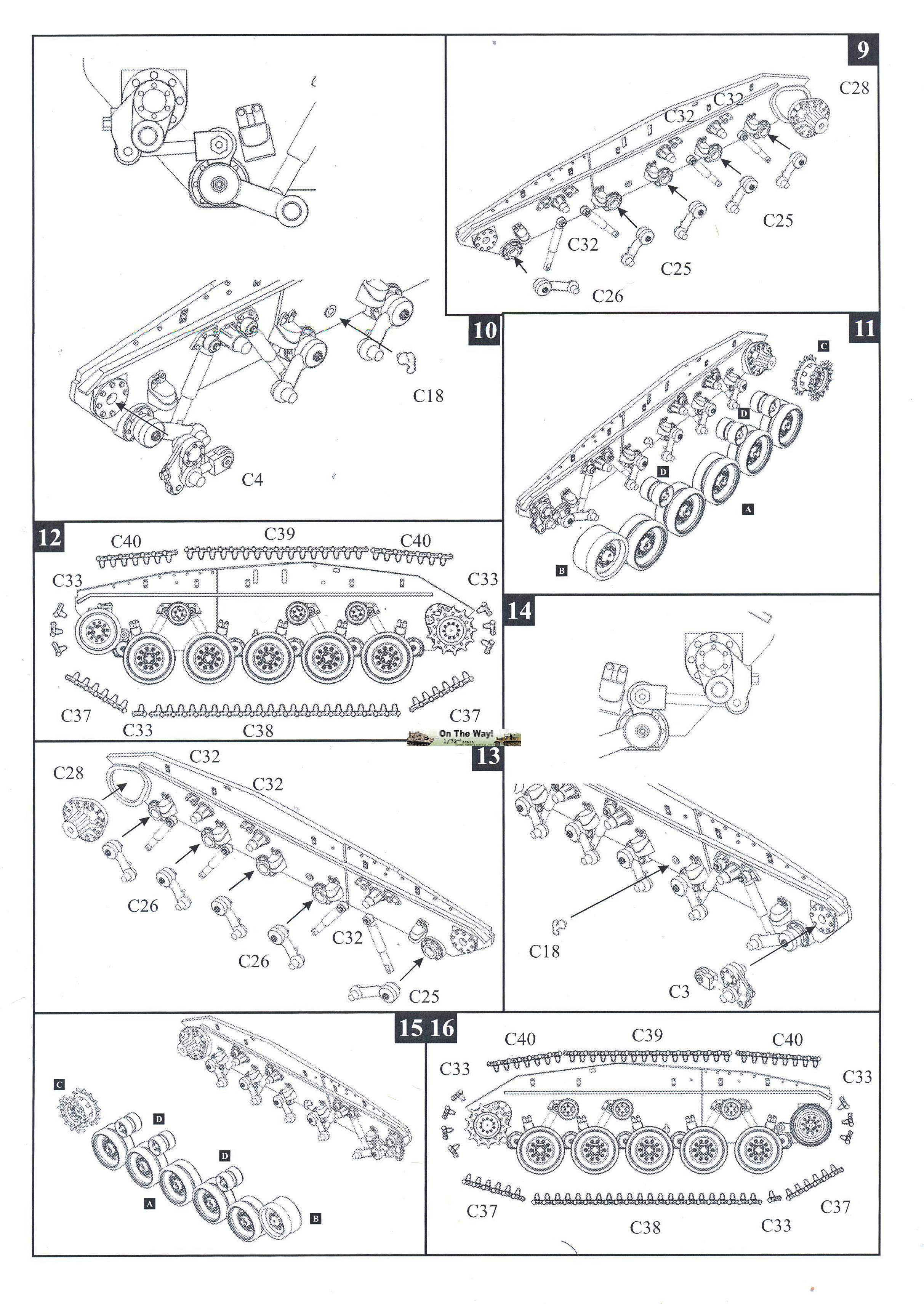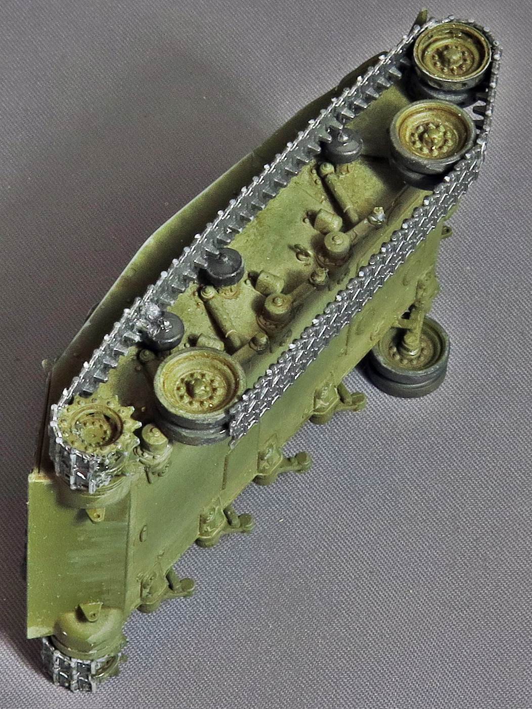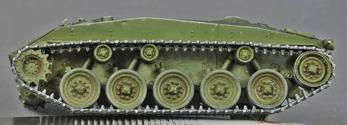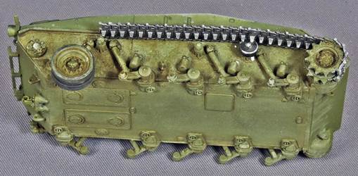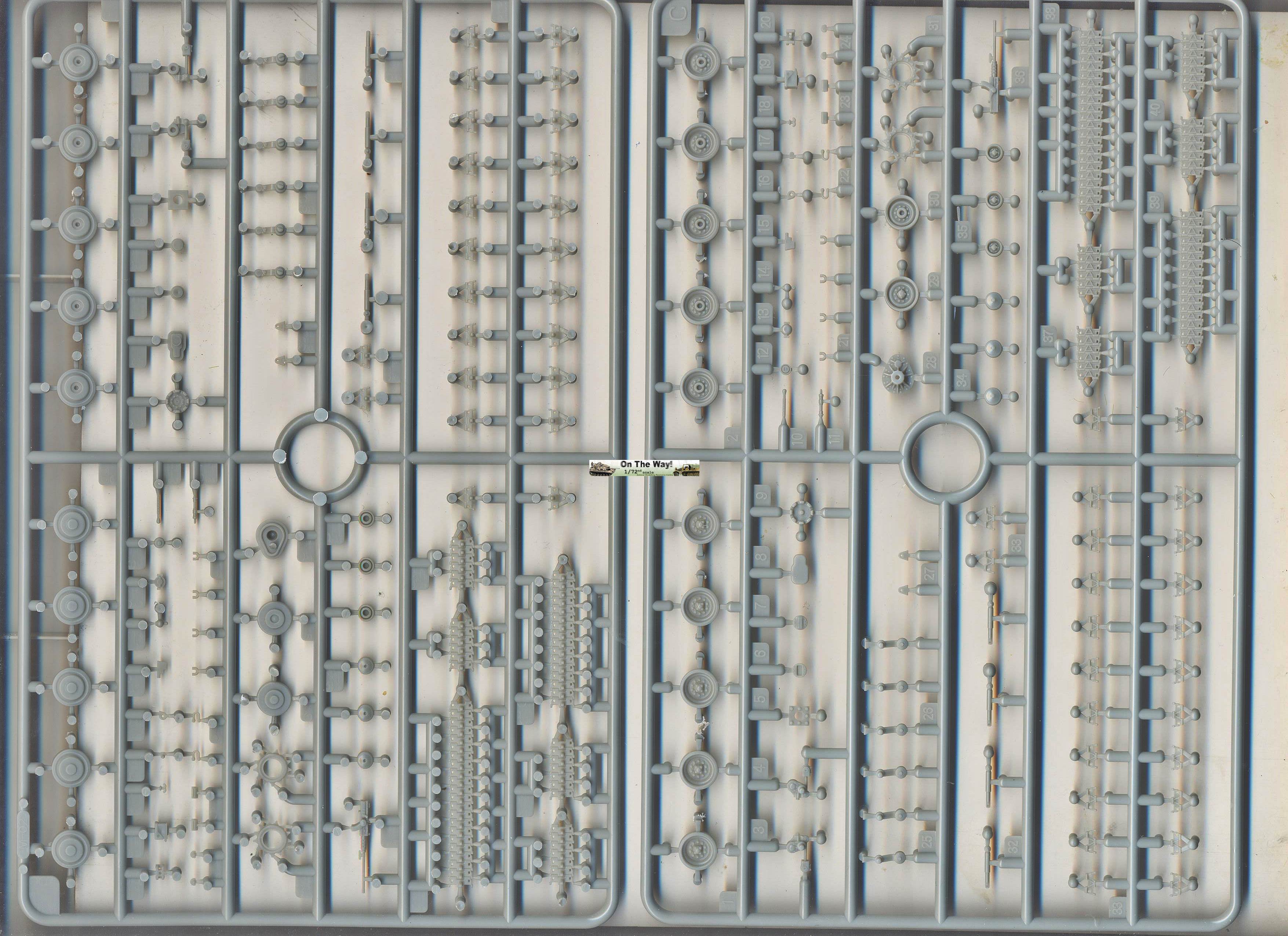 adapt it to rough terrain with only a little work. Having the Mammoth Edition, I could choose between plastic idlers and resin idlers. The resin idlers have the advantage of having the typical slots cut out in the rim, while the plastic parts lack them. While the extra detail is nice, I feel that the detail of the resin parts is actually slightly inferior due to some irregular casting of the rim. The plastic drive sprockets are also very nice, but I discovered that I needed to add a little spacer to the central drum as the sprockets turned out slightly too narrow for the tracks. The tracks are very delicately done (and are among the best link-and-length tracks that I have seen) and will require some dexterity to install. The kit comes with far too many single links, which is a blessing as