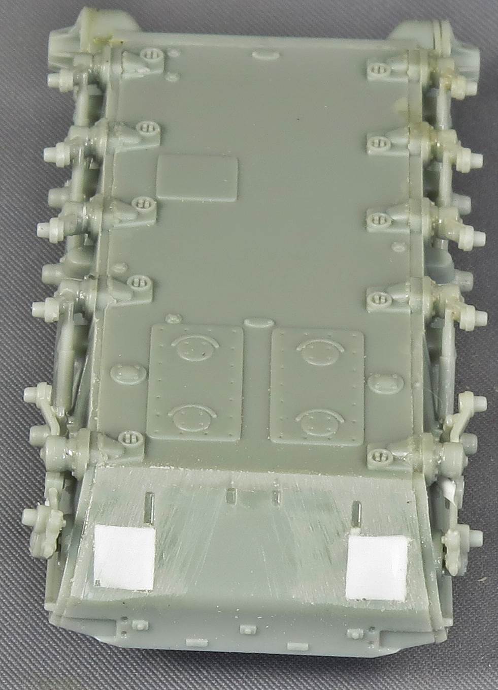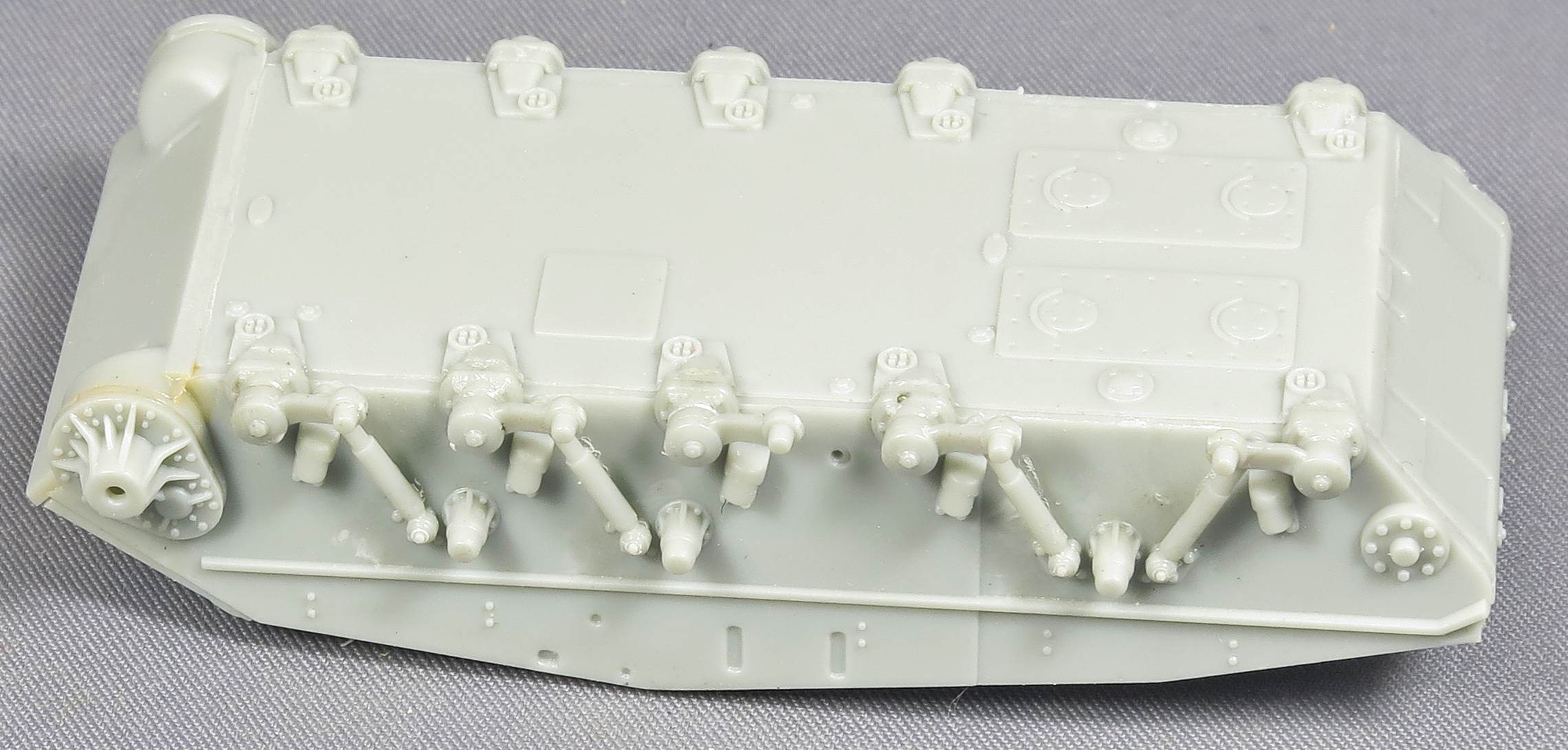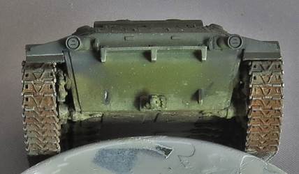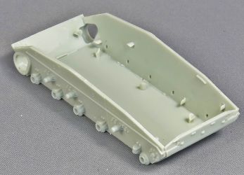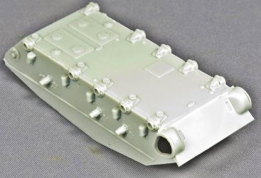 Lower Hull and Suspension The lower hull goes together well, if some care is taken. Detail is absolutely amazing. While the modeler can choose between two lower glacis plates, one with and one without the adapter plates for the amphibious pontoons (which were mostly just plugged with bolts on operational vehicles as in the kit parts), you only get the option of installing the adapter plates for the rear, or plugging them with whatever suits your fancy. I feel that OKB should have at least given flat plates to fill the gaps, or better, given a complete plate as was done for the front. As my vehicle didn't have these plates, I filled the recesses with plasticard and smoothened them out. Obviously, I should have done this before actually installing the rear plate, but I wasn't thinking ahead far enough. Note that according to [2], these attachments were introduced in November 44, while [4] mentions a gradual introduction between October 44 and January 45. [3] on the other hand claims they are attachment points for a bulldozer blade. The suspension
