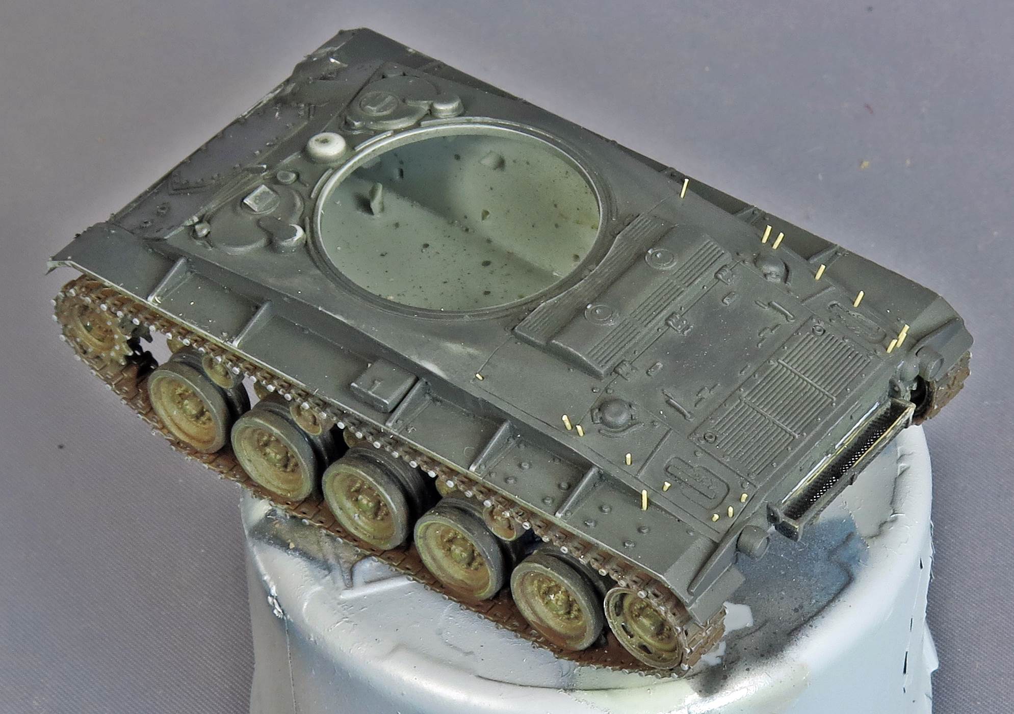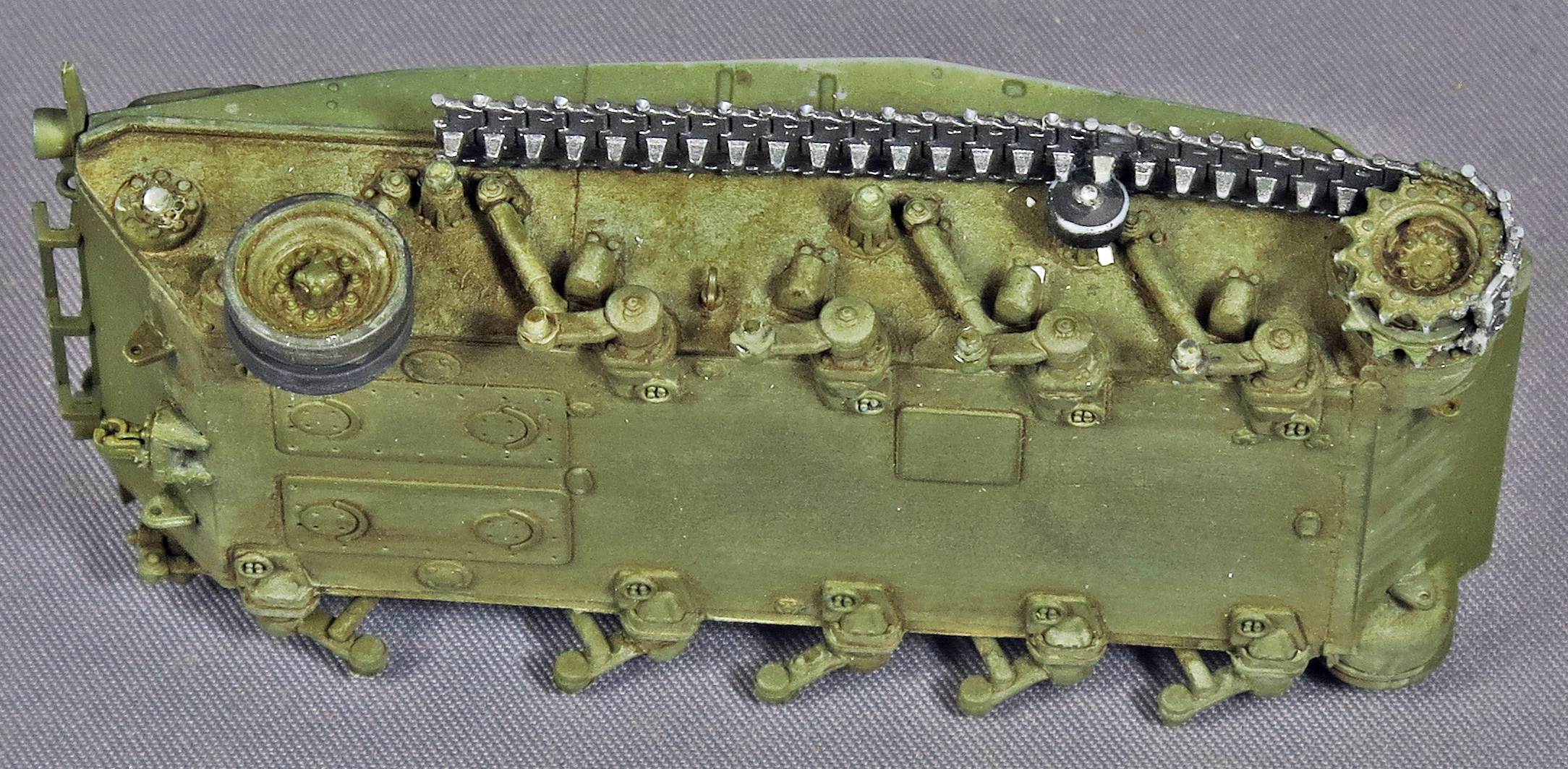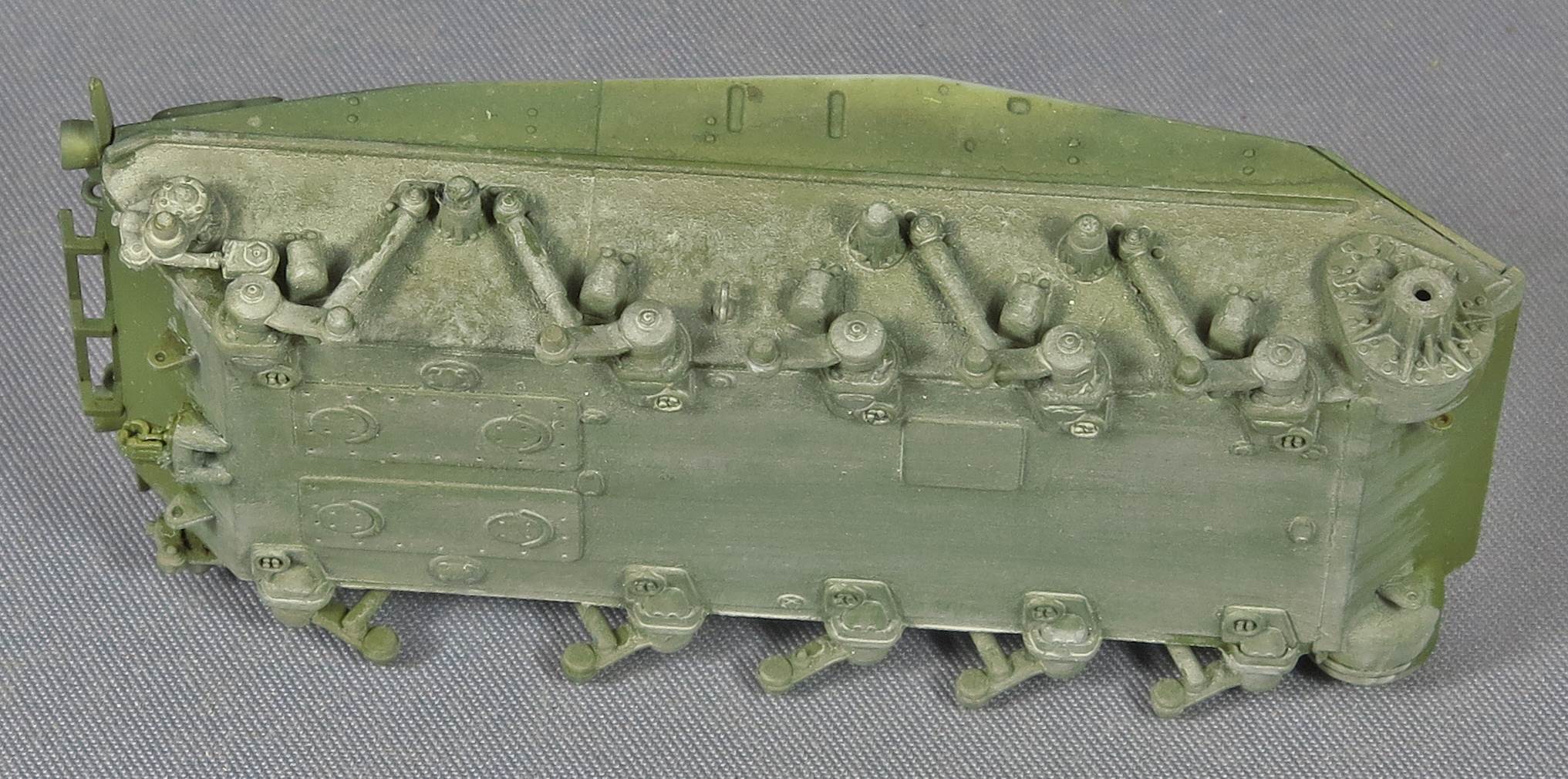 Lower Hull and Suspension The lower hull goes together well, if some care is taken. Detail is absolutely amazing. While the modeler can choose between two lower glacis plates, one with and one without the adapter plates for the amphibious pontoons (which were mostly just plugged with bolts on operational vehicles as in the kit parts), you only get the option of installing the adapter plates for the rear, or plugging them with whatever suits your fancy. I feel that OKB should have at least given flat plates to fill the gaps, or better, given a complete plate as was done for the front. As my vehicle didn't have these plates, I filled the recesses with plasticard and smoothened them out. Obviously, I should have done this before actually installing the rear plate, but I wasn't thinking ahead far enough. Note that according to [2], these attachments were introduced in November 44, while [4] mentions a gradual introduction between October 44 and January 45. [3] on the other hand claims they are attachment points for a bulldozer blade. The suspension