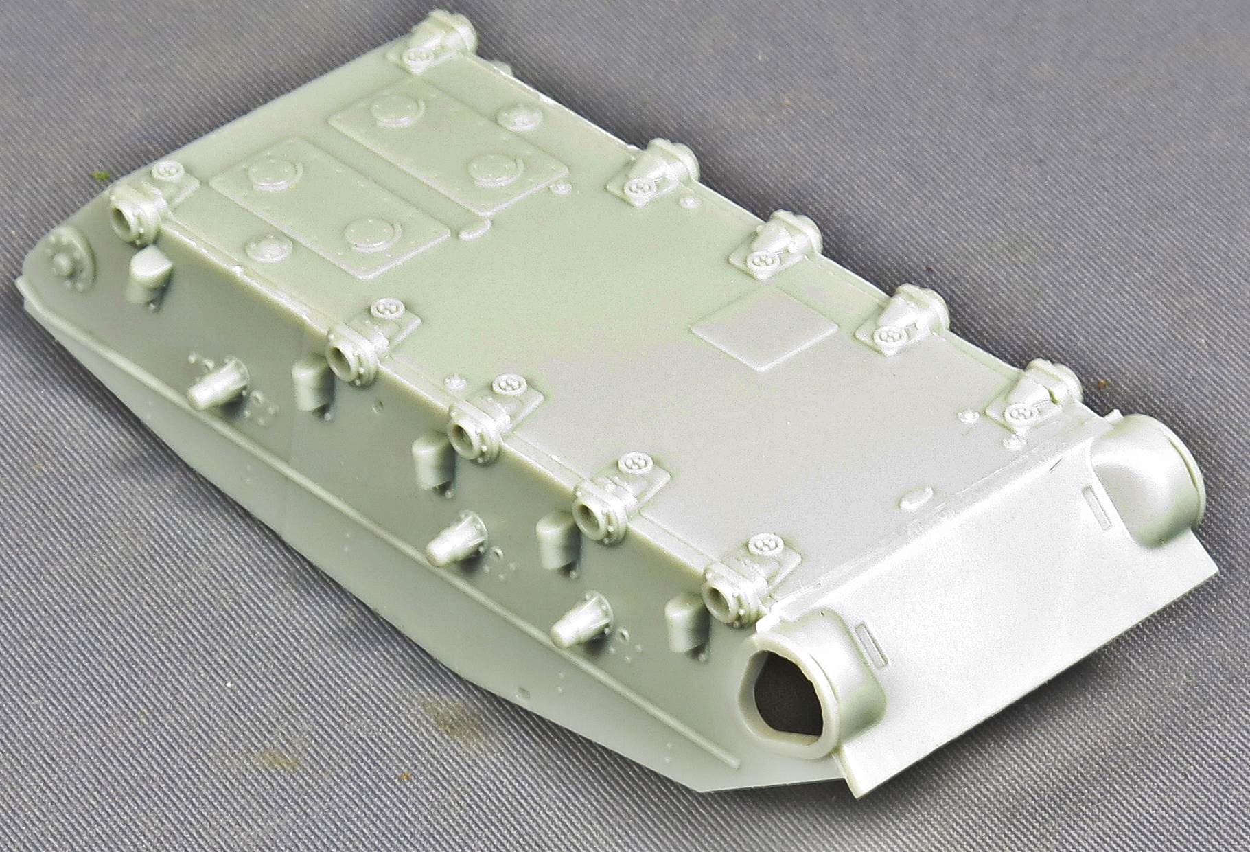 Upper Hull Construction of the upper hull didn't reveal any particular issues; the upper and lower hull are a near perfect fit. (Be careful to keep the lip between the lower and upper glacis: it's supposed to be there.) Some minor sanding was needed, but as there are delicate bolts on the engine deck near the joint, this is not an easy task in this area. In the end, I decided to shave off the bolts to be able to get a smooth joint and build up the bolts afterwards from sprue, sanded down to size. Admittedly, the result is not up to the standard of the original kit bolt I had