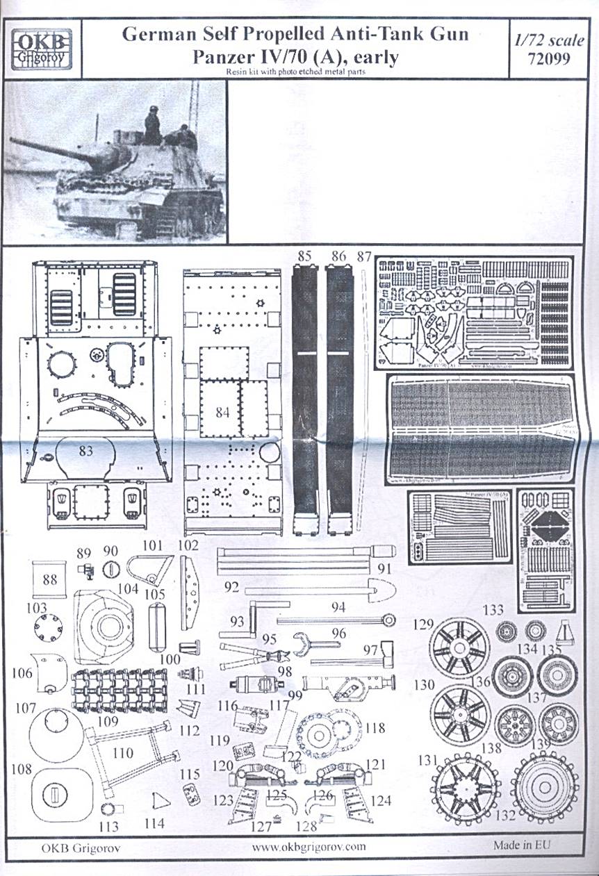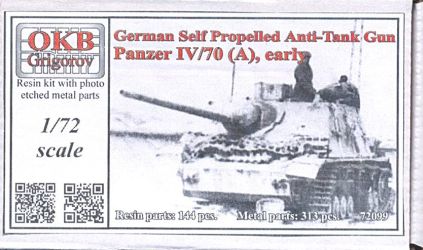 | History There were basically three versions of the vehicle we, modelers, know as the “Jagdpanzer IV”: two versions by Vomag with resp. an L/48 and an L/70 75mm gun and a version by Alkett with the same L/70 75mm gun. The two former used a modified Panzer IV chassis, while the latter used a mostly unmodified Panzer IV chassis, making it substantially higher than the other two. It is this latter vehicle, technically known as Panzer IV/70(A) and colloquially known as “Zwischenlösung” (Interim solution) that we are being offered by OKB Grigorov. At the time of release, it was (as far as I was aware) the first time that we were being offered this vehicle as a complete kit in this scale, although conversion sets had been available for a while from different manufacturers. Soon afterwards, UM also released their own kit. A point of note is that the operational doctrine of the Wehrmacht did not consider this vehicle to be a Jagdpanzer, but to be a substitute for a main battle tank, more specifically in the II. Abteilung of a Panzer Division when insufficient Panthers (carrying the same L/70 gun) were available. (This means that the use of “Self Propelled Anti-Tank gun” on the boxtop isn’t entirely accurate.)