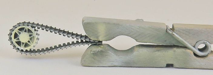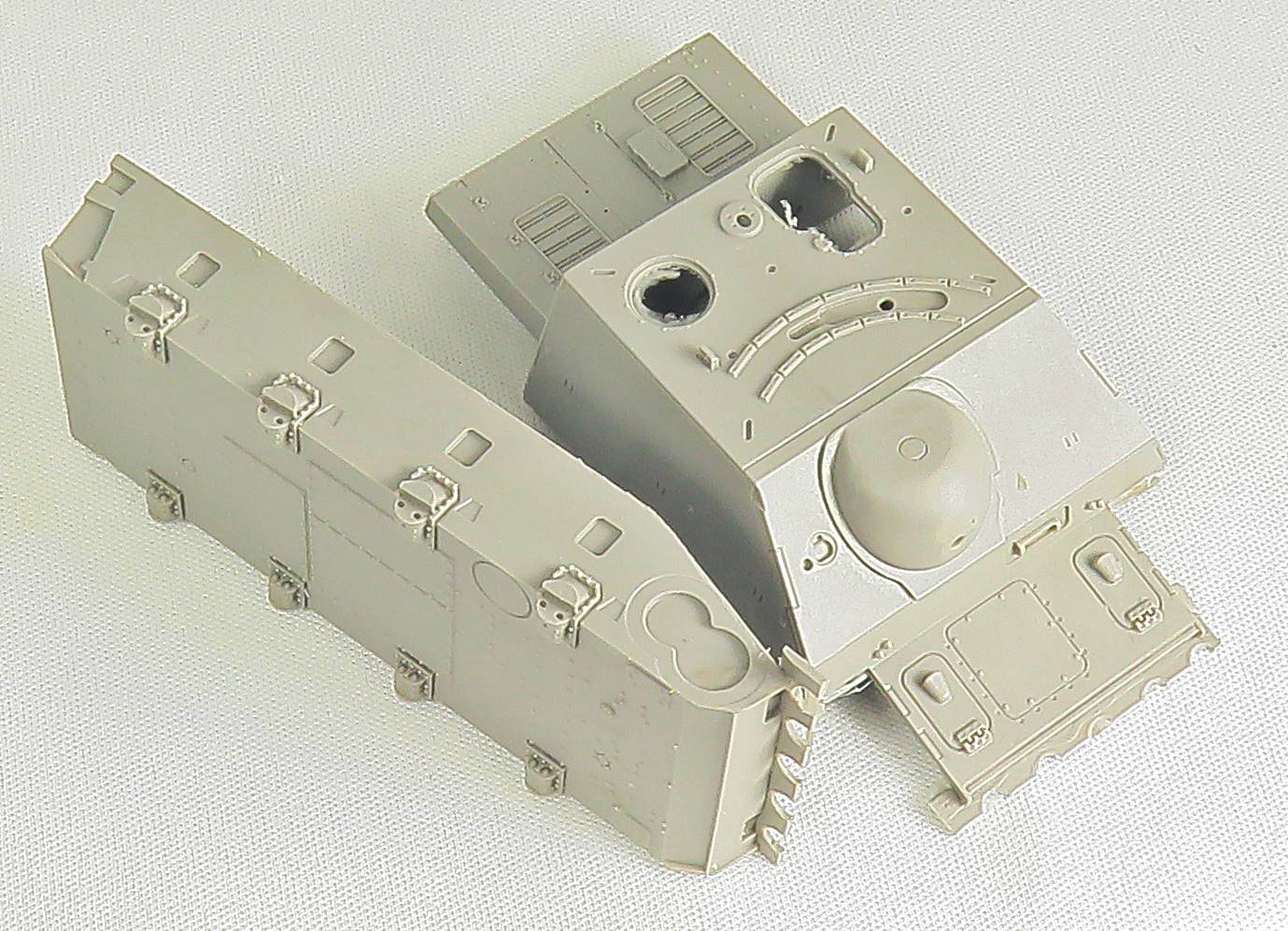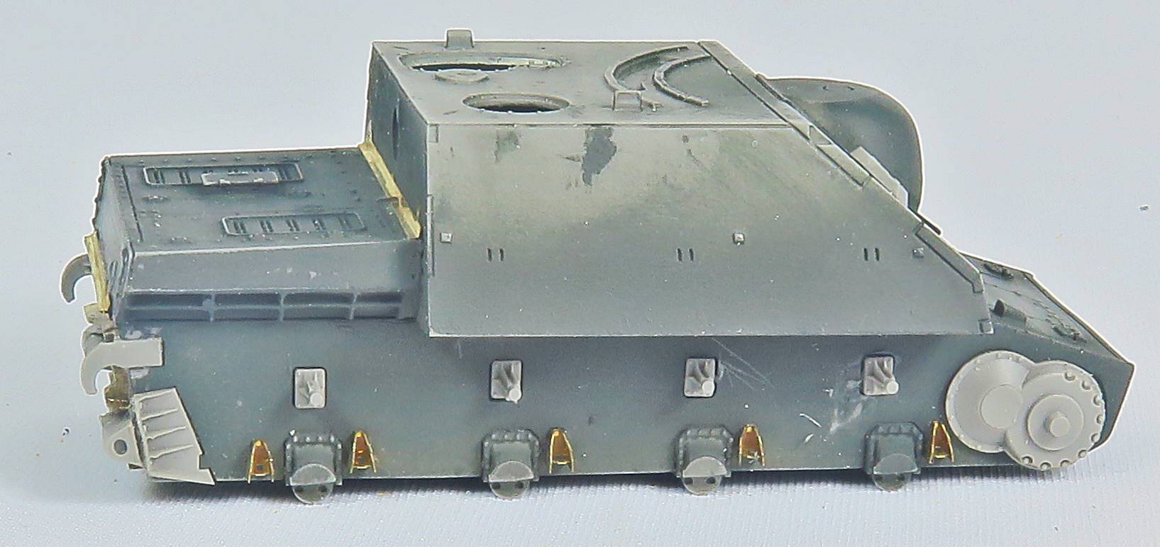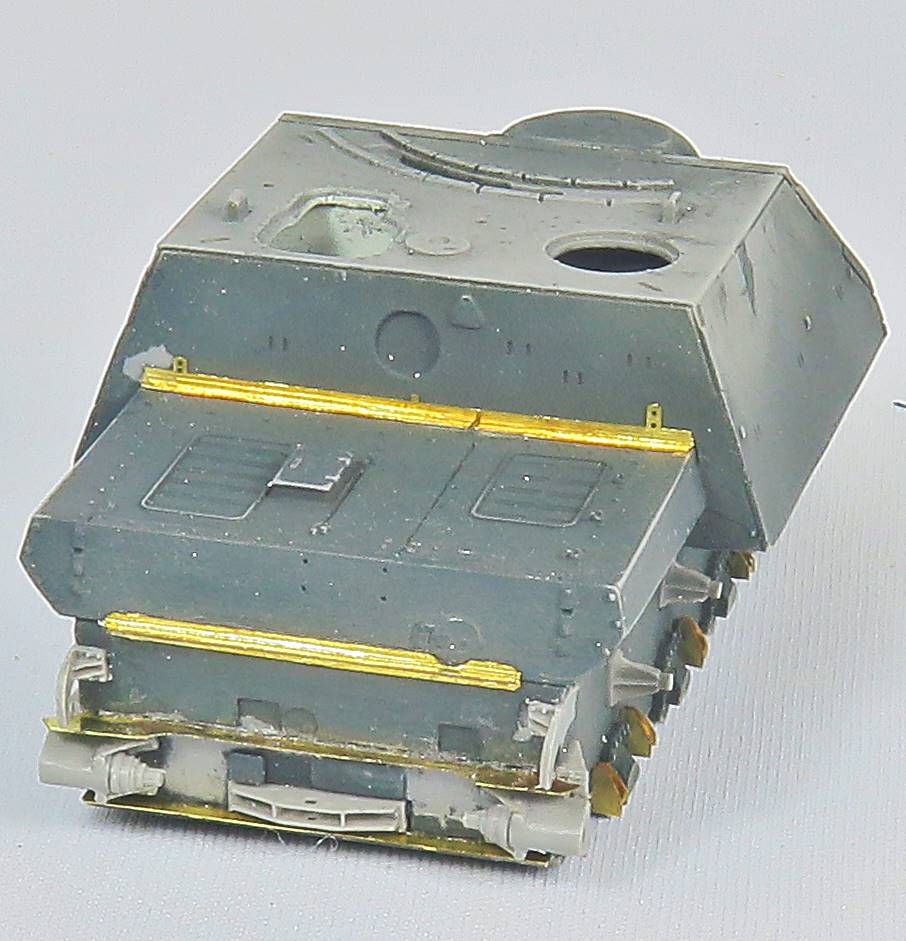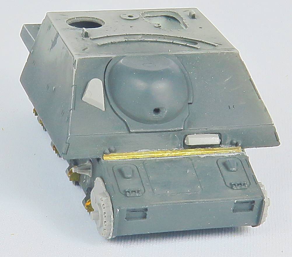 The resin parts are nicely cast, but, at first glance, not without the occasional fault. For instance, the rear upper hull plate has a waviness to it. Sanding it flat would be an option if it wouldn’t remove the details in that area. Bending after heating in warm water is a better option; it took me two minutes. Some panel lines on the engine deck might benefit from rescribing. (Perhaps the molds are already getting worn.) There also was a rather large air bubble on the gun housing, covered by very thin layer of resin that didn’t stand up to any handling. It’s in a partially hidden spot and rather easy to fix, though.