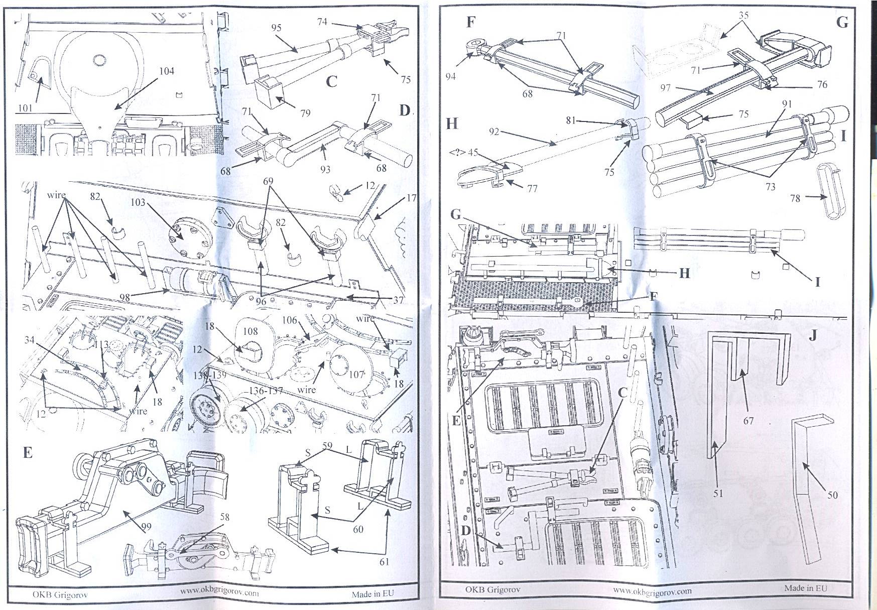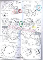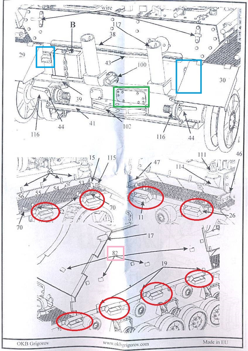 Actual construction started by mating the upper and lower hull, adding bits and pieces along the way, starting with those that were the least likely to break off during handling of the kit. The reinforcement strips that hold the different major assemblies of the (real) vehicle together are provided in PE. As they are long and slender, and as I don't have a bending tool, folding and installing them was a challenge, as any deviation from a straight line will show. Corrections were made with thick paint. Some notes about the parts on the first page of the instructions (above):