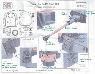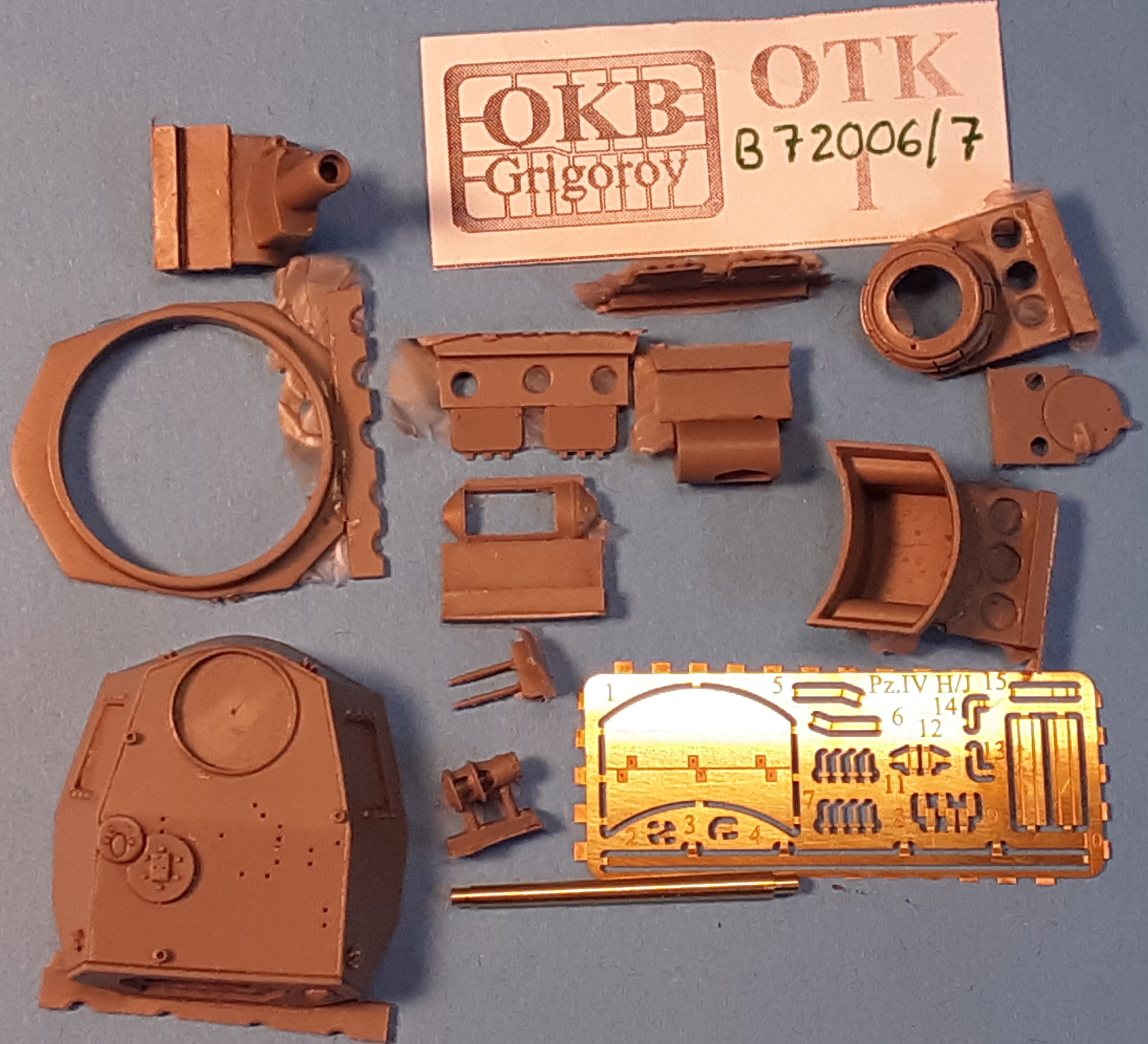 | This kit preview covers an aftermarket turret set to convert a German Panzerkampfwagen IV Ausführung H or Ausführung J into a late Pz IV Ausf. J built in the winter of 1944 through the Spring of 1945. This set replaces and upgrades the complete turret for a 1/72 scale Pz. IV Ausf. H or Ausf. J kit such as the Revell Pz IV H kits 03119 and 4184 and Ausf. J kit 03112, the Dragon kit 7497 and Zvezda kit 5017. Going clockwise, at upper left we have the gun mantlet and recoil housing. Next are two pour plugs holding four turret side doors. At upper right is the late war cupola which I believe is referred to as the Type 3. Rather than lifting on a hinge, the cupola hatch lifts and pivots like the Panther and Tiger cupola hatches. (These cupolas can be bought separately from OKB Grigorov, set 72376.) The cupola has open view ports which is important for modeling the tank in combat. Below the cupola is the turret storage bin with separate brass lid so we can model the bin open. At center bottom are the two MG34 machine gun barrels for the turret and the hull ball mount, and the KwK 40 muzzle brake. The turret, at lower left, is superbly cast with screw detail, weld seam detail, three Pilze jib crane mounts on the roof, and the four lift hooks on the upper side. The cupola and side door opening are covered by a thin sheet of resin that is easily cut out with a sharp blade if we wish to model the hatches open. If we do model the doors and hatches open we better install some detail inside the turret. The gun mount opening is also blanked over by thin resin which we should cut out in order to mount the gun parts.