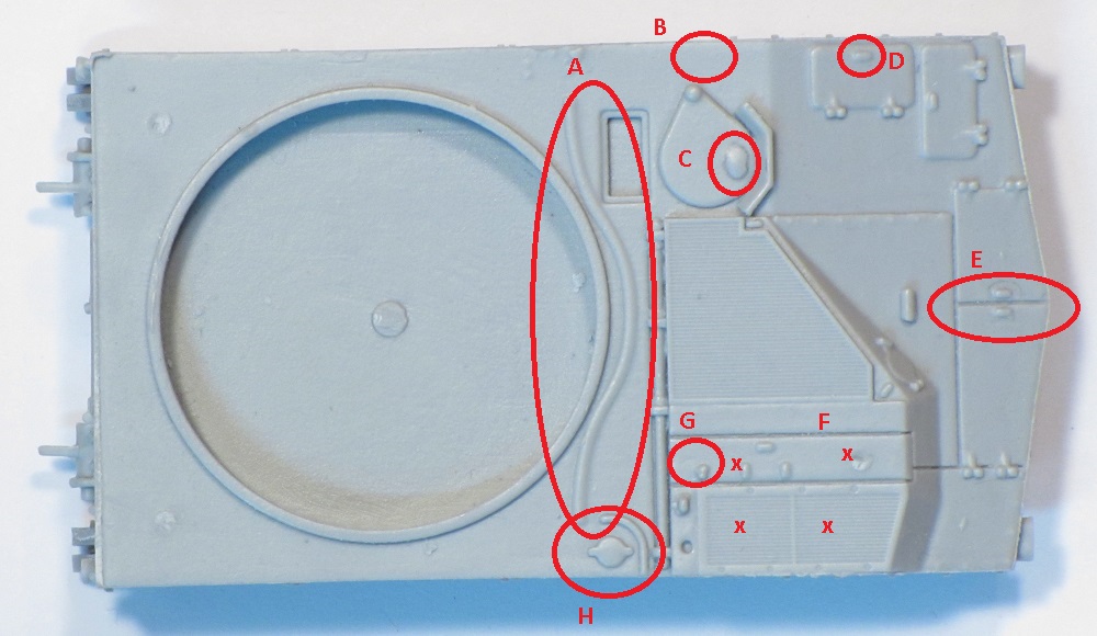 The detail on the top of the hull is a little softer than the turret, and again there are several missing or inaccurate details, so here's my corrections list