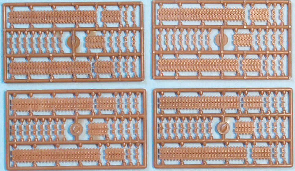 For the tracks, OKB Grigorov provide 4 sprues of their T97 track links. This is a bit of an issue. The M53 and M55 were based on the automotive components of the M46/M47 tanks. They were equipped with the T84E1 rubber chevron tracks. The T84E1 tracks were the ultimate evolution of the Sherman HVSS tracks, and kept the same dimensions as the HVSS track - 23 inches wide and a 6 inch track pitch. The T97 tracks were introduced with the M48, and were substantially wider at 28 inches and also increased in pitch to 6.94 inches. In scale, that means that a T97 track link is 1.8 mm wider than a T84E1 track link. The OKB tracks are also slightly over scale, so the error is closer to 2.2 mm. Aside from the width difference, the inside face of the T84 tracks is essentially plain, while the T97 tracks have a partial width rubber pad, and exposed metal on the outer sections. The OKB tracks faithfully reproduce this detail on the T97 tracks. As noted in this review on OTW, the injection moulded tracks suffer from sink marks on every link. |