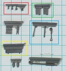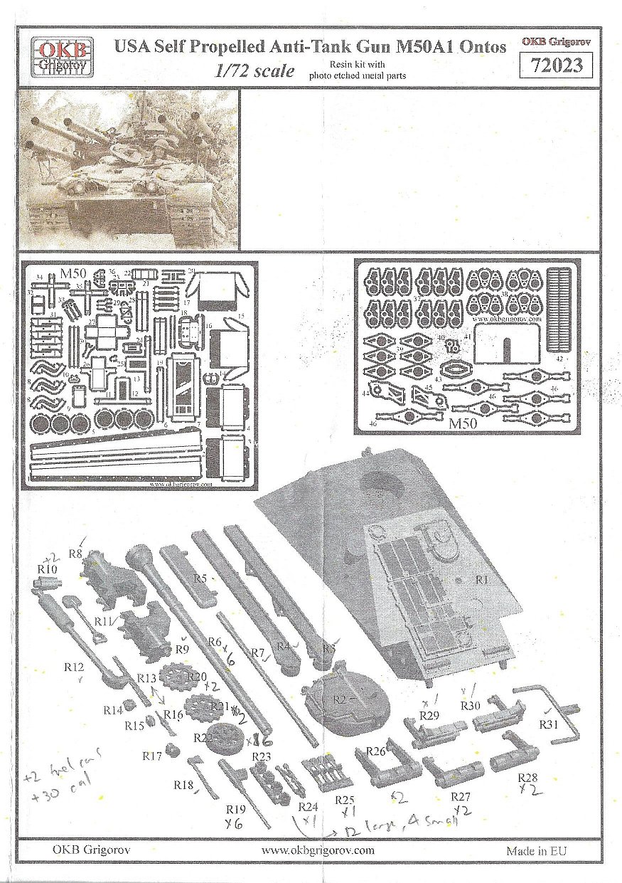 The kit provides six M8C 50-calibre spotting rifles (parts R19, red box in below photo), however on the Ontos only the upper 4 recoilless rifles were fitting with spotting rifles,