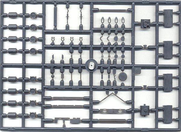 The above sprue shows most of the miscellaneous details that come with each and every KV kit. It includes spare fuel cannisters, fender stowage bins, tow hooks and rings, the end-loops for the tow cables (which need to be manufactured by the modeler), as well as numerous smaller details.