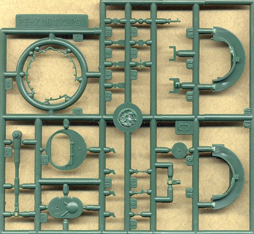 Parts are finely and delicately cast. Assembly of the hull requires gluing the top, the two sides and bottom together. Thin flash is on a number of small parts though clean-up does not appear difficult. Unlike the PST T-55 model, the torsion-bar suspension arms are not separate but are molded onto the hull sides (typical of most small scale models).