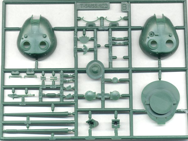 The hull and turret sprues are presented above. As you can see, these kits are very well molded, with little flash, and only a few sinkmarks (though more than I usually like to see). The detail is very crisply molded, abundant, and fairly accurate. The hull underside looks especially impressive, in case you want to build a diorama of an upside-down Iraqi T-55. Because of the redunancy of some of the sprues, you will have several spare parts from each kit, including almost a complete turret. The T-54 turret has a few details different from the T-55, most notably the cupola for the loader's hatch. Again, the detail on these parts is molded very well, but I have noticed a couple of deficiencies: the turret roofs lack the heavy weld-lines that make the distinctive Double-D pattern around the hatches. This should be easy to add on my own, either etching it in, or else using putty. And if I mess it up, at least I'll have a spare turret as backup :)