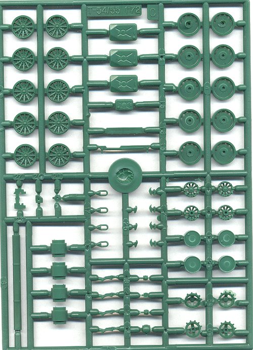 The T-55 sprue (pictured below) is mostly the same as the T-54 sprue, but comes with different wheels: the starfish pattern, which was common on T-62 as well, so these could be used in place of the horrible wheels on the ESCI T-62 kit. The wheels (on both of these PST kits) are very well done. While the starfish wheels are better than the wheels in the early ACE kits (such as the one I built), I have seen scans of the "new" ACE wheels included with later releases of the ACE T-55, and they appear to be about equal. But the chassis on this PST kit looks like it will be much easier to assemble than the ACE kit.