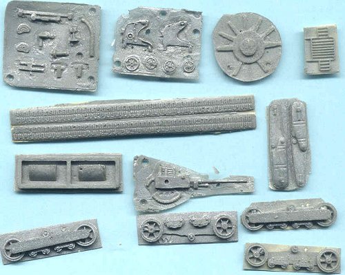 Photo 6. Scan of the AER resin parts shows the silver-gray resin of the suspension, tracks and gun parts. The resin is similar to other AER resin models: a silver resin with a paper backing. It appears that this may need a lot of sanding to clean up. Freeing the thin gun barrel from the resin may be a problem. The tracks, once sanded to correct thinness, will be heated in hot water and bent to shape over the sprockets. Assembly of the suspension, after clean-up, looks to be quicker and easier than the PST injection molded kit. Interestingly, the AER resin tracks have a more authentic track pattern than the PST kit. Perhaps there were two or more track patterns produced?