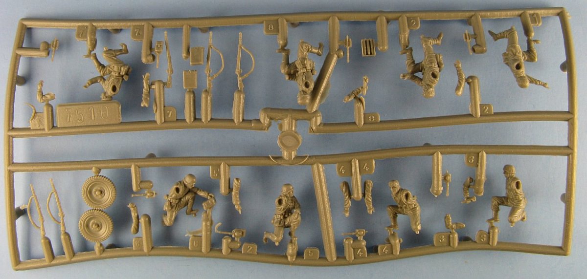 I won’t go into a lot of detail on the history behind this gun. Suffice it to say, the 75mm leIG18 was introduced into the German Army in the early 1930s as a close support weapon for infantry units and was used throughout World War Two. The kit’s parts come on two sprues. One sprue holds 32 parts for the gun molded in hard plastic. The other sprue is of soft plastic containing the figures (8 gun crew in total) plus their kit and weapons. On this sprue there are also three gun related parts for two optional wheels plus an open ammo case exposing 3 rounds. The modeller has the option of two wheel styles: steel rimmed spoked wheels intended for horse drawn transport (hard plastic) or pneumatic tire wheels for motor vehicle transport (soft plastic). My review will only concern itself with the gun. Instructions are simple and easy to follow and you can pretty much follow their steps as laid out. Gun parts are molded very well with nary a seam or sink mark to be found. It’s unfortunate that Pegasus decided to put the extra wheels on the soft plastic sprue. Construction is straight forward. I chose the spoked wheels option, assigning the pneumatic wheels to the spares box. I only made two simple modifications to the kit. First was some thinning of the shield edges with some judicious scraping with a hobby knife followed with some sanding to smooth everything. The other was to drill out the barrel opening to deepen it and make it look more realistic. I found it easier to build the gun in four separate assemblies - carriage, wheels and barrel. I left the small traverse and elevation wheels off (added in steps 2 & 3), as well as the sights (added in step 3), until the end to prevent them from being broken or lost during painting. The instructions provide overall gray as the sole painting option, which is the one I chose for an early war horse drawn weapon. I suppose it would be equally valid to paint the gun later war yellow, or even yellow with brown and green patches, especially if the modeler chooses the pneumatic tire option. As for the figures, they look quite nice to my untrained eye, though they are molded in soft plastic and do show some very fine seam lines. For a review of the figures I suggest that the reader visit the Plastic Soldier Review site. There are no instructions for painting the figures, so it is left to the modeller to find the colours for these for himself, or use the box top artwork as a guide. A nice little kit overall. Fit is great. Molding is great. Modifications required are few. Addendum by Al Magnus (14/October/2016) References: Review sample purchased by the author. |