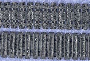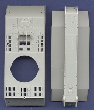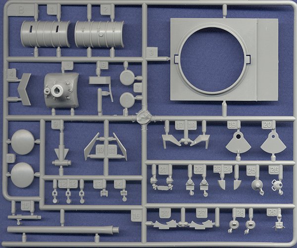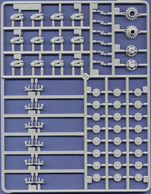 It comes with about 150 parts in grey plastic, the tracks in black vinyl, a small decal sheet and two metal axles to keep the sprockets turnable, which was done to simplify the mounting of the tracks. The plastic parts are all of a good quality, with only a little flash especially between the openings in the upper hull, which also show soft detail.
