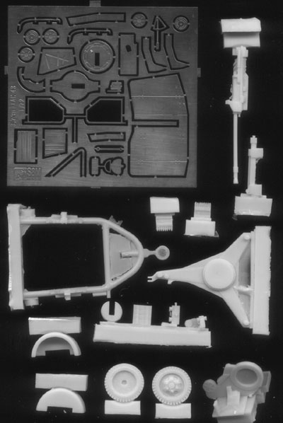 Another excellent gun kit from Planet Models. All of the resin parts are crisply molded with abundant detail. The gun barrel is slightly warped, but that shouldn't be too hard to fix. It includes the gun base stand, as well as the towing rig.
