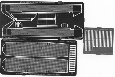 The etched parts are done by Eduard, and include replacement fenders (good thing: because the Hasegawa fenders stink), as well as the mesh side skirts and brackets. They're not quite as complicated as the PART mesh skirts, but they should look just as good.