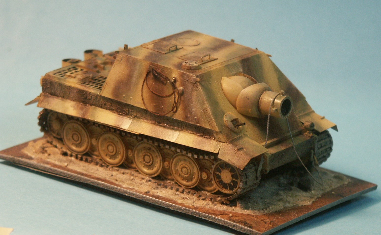 The model was finished in a three-color camouflage as portrayed in the instructions and in several historical photos. None of the wartime photos show Sturmtigers in the field to have crosses or unit markings so I did not add any to the model.