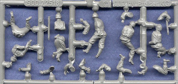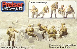![]() This small set contains only five figures: enough for a single Pak 40 gun crew. This set is probably the weakest set I have seen from Preiser, in that the figures have fairly indistinct uniform and equipment details, and there are so few of them. I think that this lack of detail was due to a trade-off between detail and realistic poses. The figures are all in very life-like and specific poses, and their use for anything other than a gun crew will be limited. But that is not to say that these are bad figures, which they certainly are not. For the same reasons that the detail is softly molded, it will also be very hard to see, so with a good paint job, as well as perhaps some individual kit and accessories from Preiser's earlier sets, these figures should turn out excellent.
