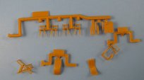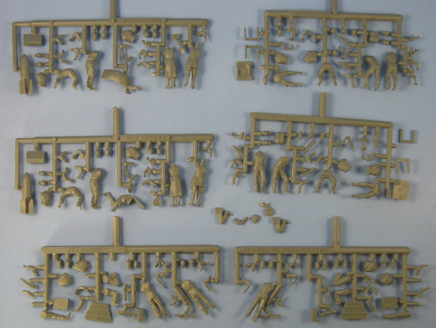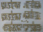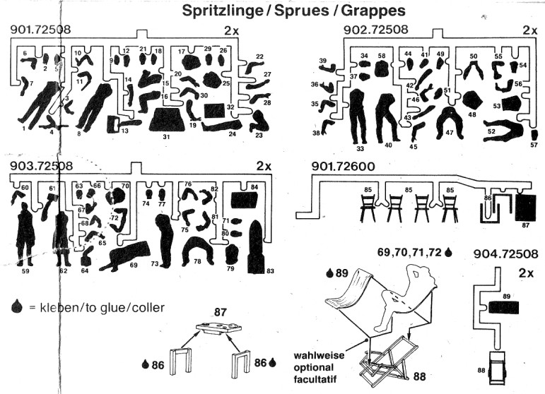 Set contains six sprues molded in a medium grey colour (two each of three different sprues) for the body parts plus one sprue molded in a butterscotch/caramel colour which contains chairs and