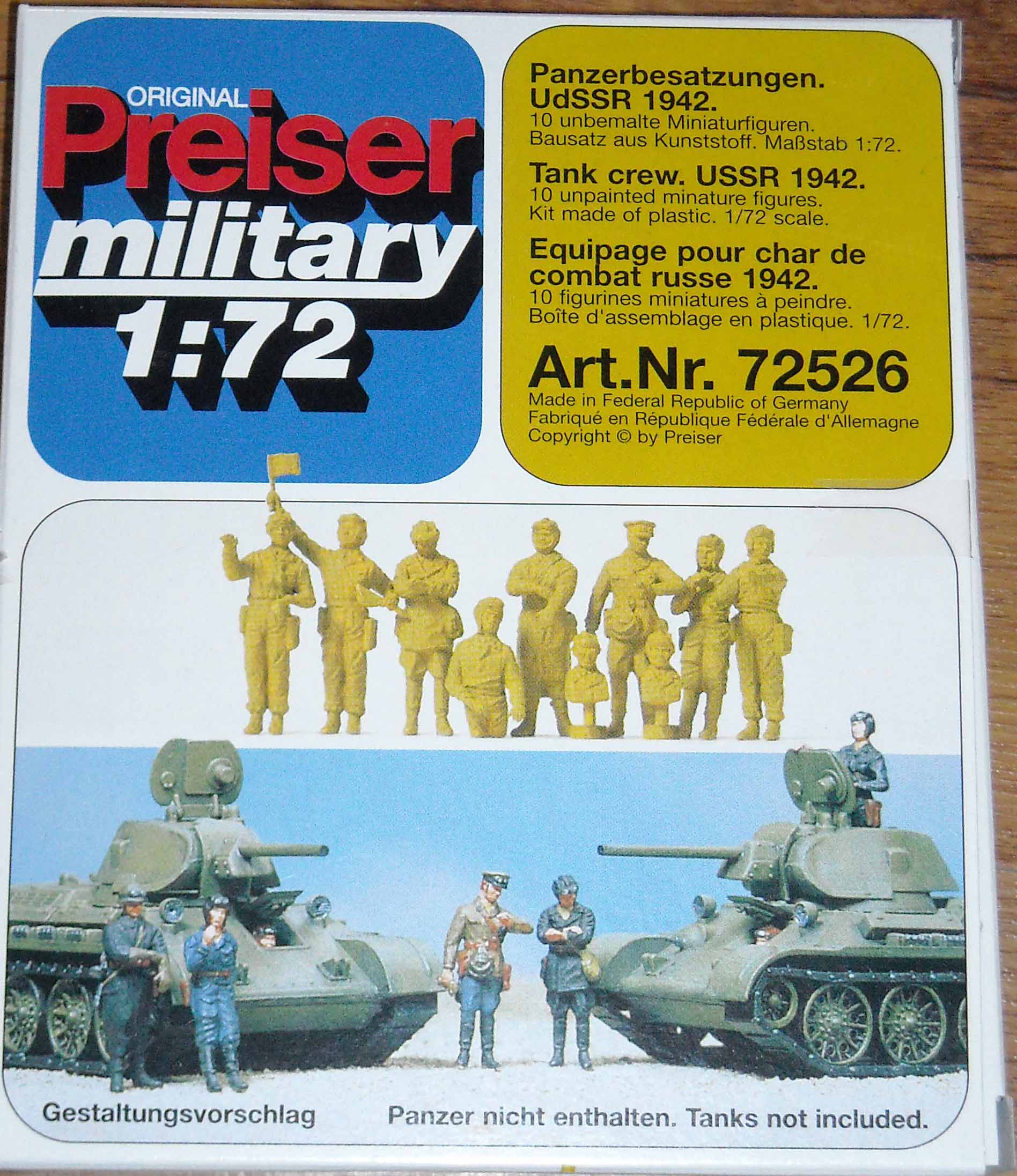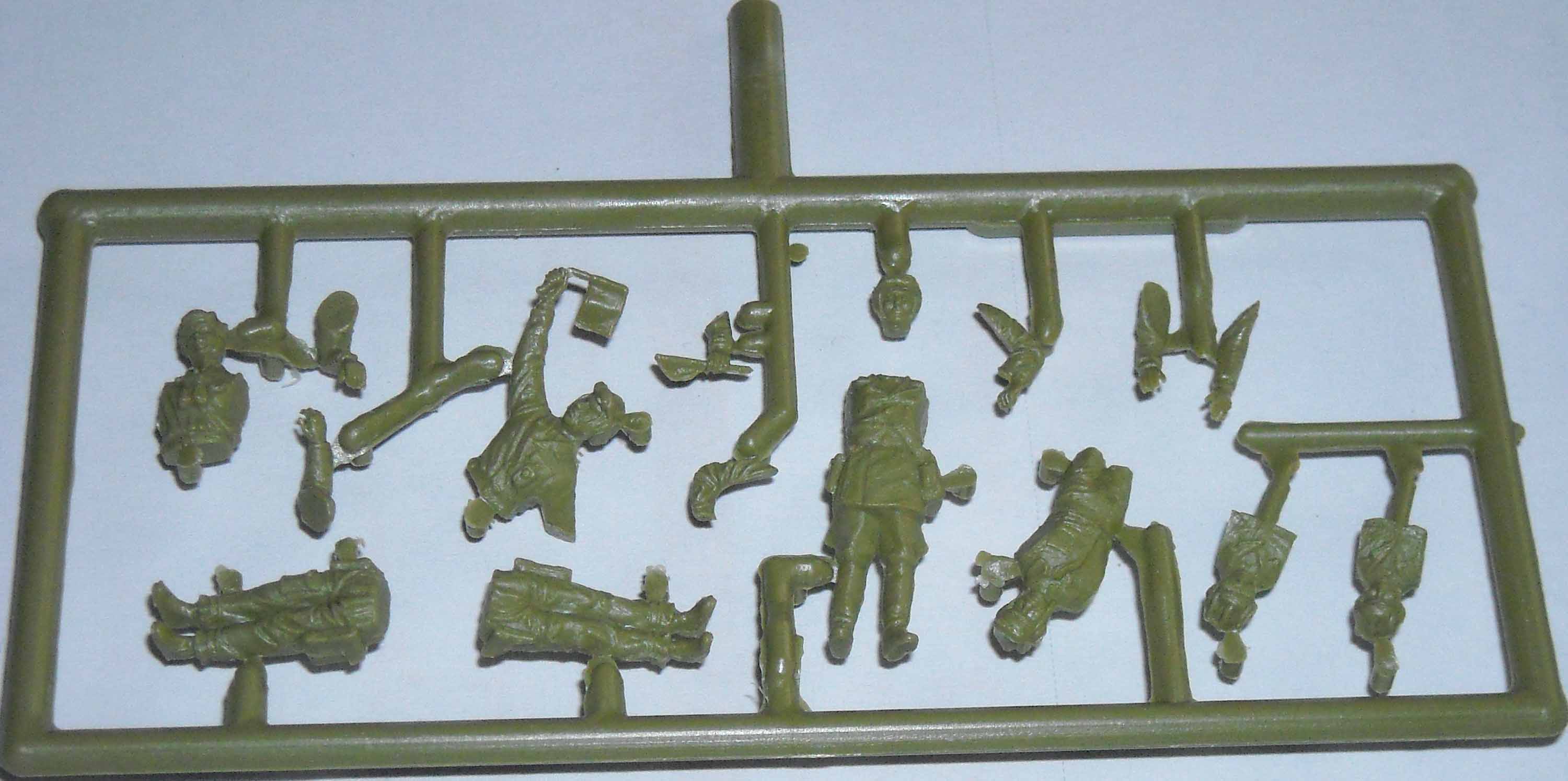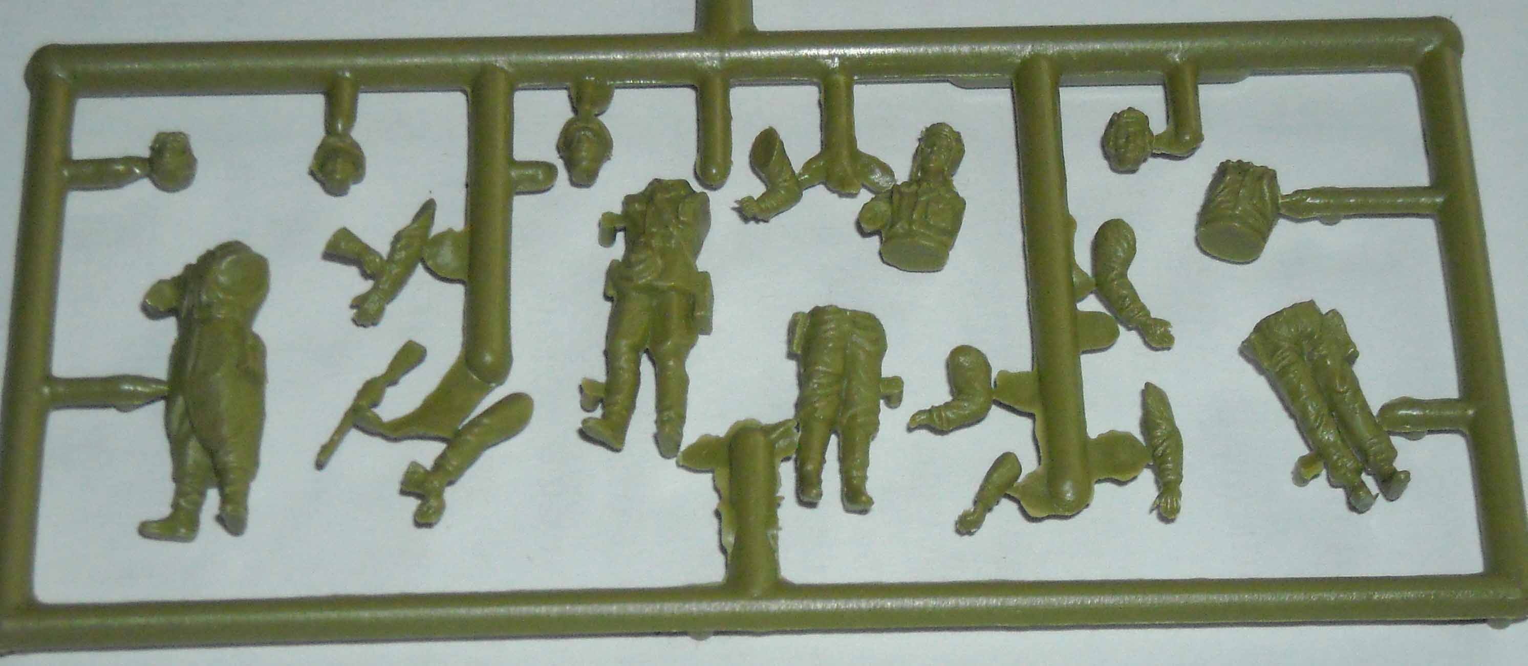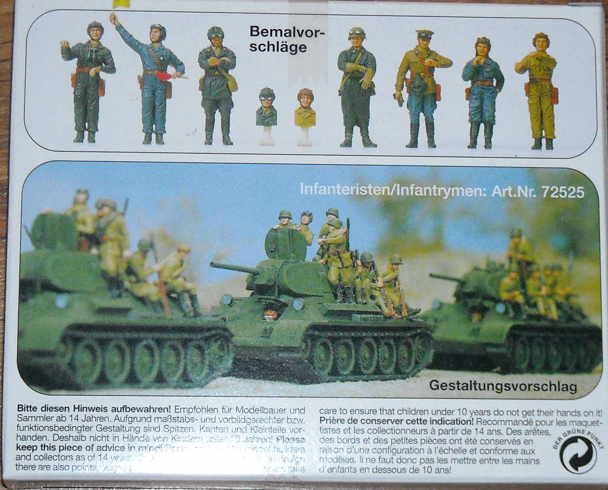 no additional sprues of accessories. This set is nicely sculpted with recognizable facial expressions. Only the submachine gun (a PPSh I assume) is a bit blurry. Assembly instructions - for as far as you need them - are on the inside of the box, as is usual for Preiser. To access them, you will need to cut the box up. |