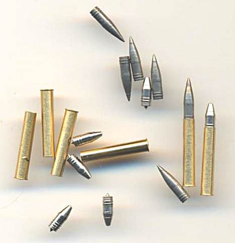 | In this set you get 6 (hollow) cartridges and 12 separate projectiles of two types. The ammo