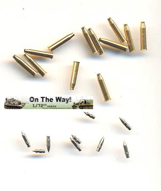 The Ordnance Quick-Firing 17pdr was a 76.2 mm gun developed by the United Kingdom during World War II. It was used as an anti-tank gun on its own carriage, as well as equipping a number of British tanks, like the Sherman Firefly or the Centurion, and tank destroyers, like the Archer or Achilles. The Comet used a slightly different gun, with shorter projectiles (from Wikipedia). This set contains 12 empty brass shells and 9 aluminum (?) projectiles (3 each of 3 types). The latter can be inserted into the hollow shells to make a complete round.