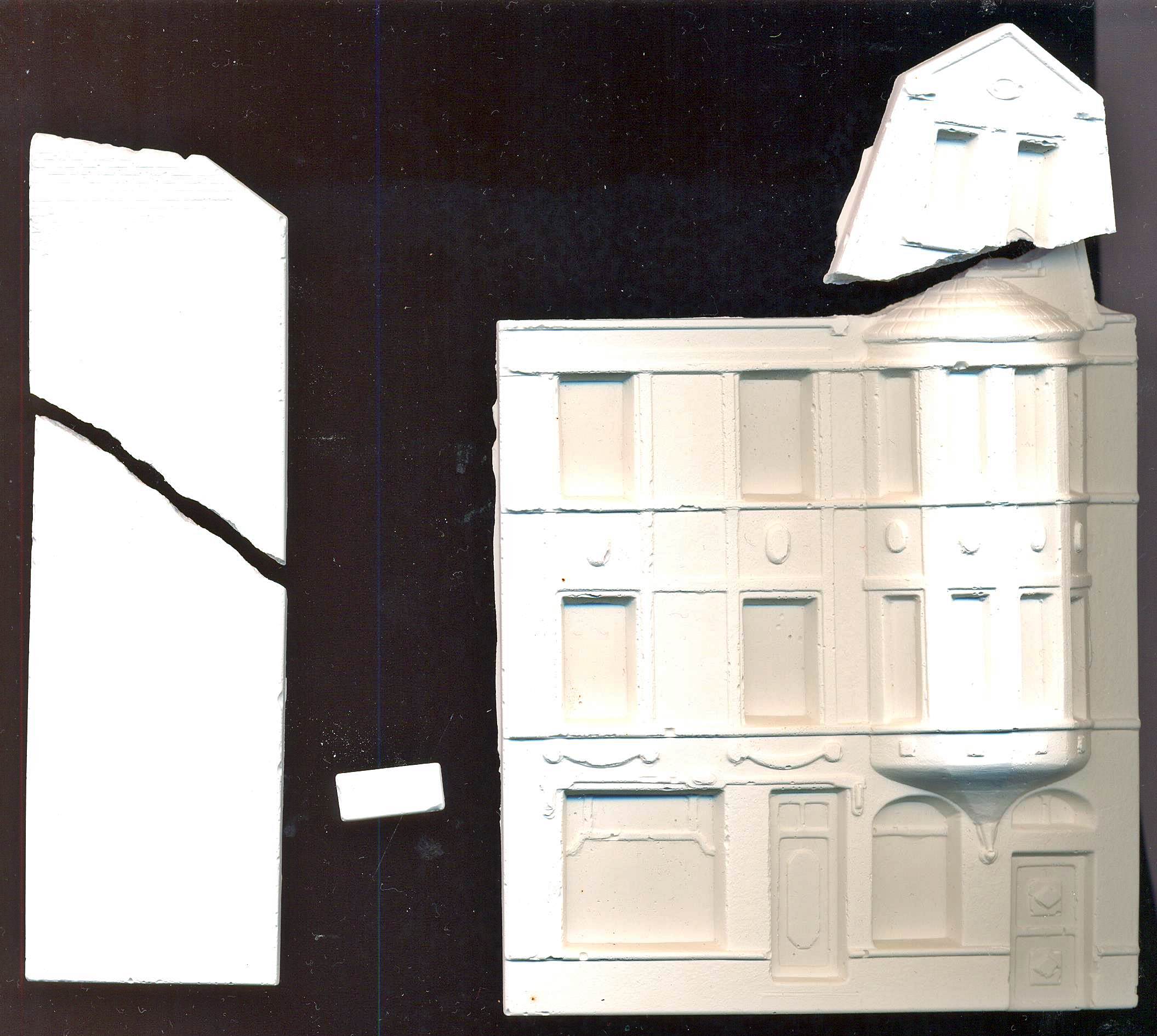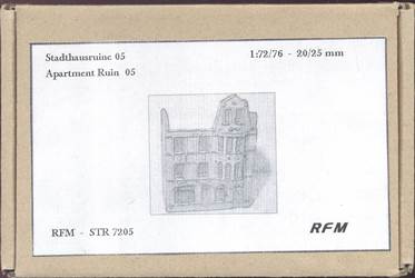 | This is a simple set consisting of 3 plaster parts. Mine actually consisted of 5 parts as both big ones were broken, even though the set came in bubble wrap and a sturdy cardboard box. You get 2 wall sections with rather nice outside detail and a small brick-like part that will serve as a step for the middle door. (Thanks to Tomáš Jakl for pointing that out to me.) Sadly, there is no detail on the inside (as is often the case with this kind of set), nor are the windows open. This means architectural scratchbuilders have their work cut out for them. Sample kit bought by author a long time ago. |