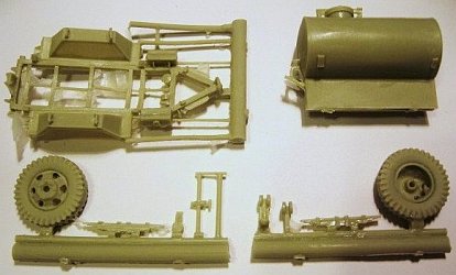 This RetroTracks kit is molded in a light pea green resin and consists of 11 parts. There is an option to have the trailer's 3rd wheel modeled in the up position for towing, or down in a resting or parked posistion. There is a small amount of flash on the parts. I also found the trailer's frame to be warped and the tank to have a less than perfect shape. The axle for the wheels was warped and out of round so it was replaced with a piece of plastic rod. I'll probably add some safety chain to the towing eye to give it some additional detail. When assembled, the trailer is less than 2 inches in length. While searching for pictures on the web of this kit, I found the photo on the box-top right away. It's from a Army Reserve center in Dallas Texas, circa 2005.