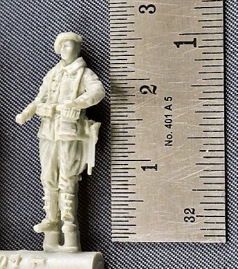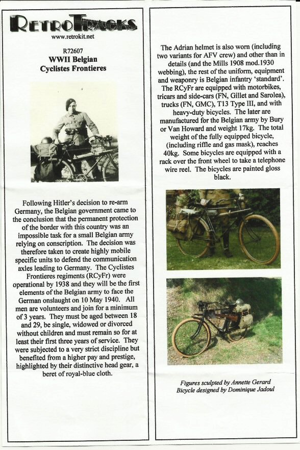 This set contains three crisply moulded figures of WW2 Belgian “Cyclistes Frontières” and one Belgian purpose build military bike. The soldiers and their uniforms look the part, except for the unit’s special headgear, an oversize royal blue beret. In reality this was almost as flat as a pancake on the side of the head. However, here they are much too round. You can see what the beret should look like here. Height of the figurines is 25mm or 1 inch which means about 1m80 or 6 feet in reality, so spot on. The bike is a delicate little kit combining a resin frame (on two sprues) with PE wheels. PE is a good solution for the wheel spokes but the tires themselves will look too flat once assembled. A concise construction sheet is included which does the job. Some resin parts have a little flash and one or two air bubbles are present, but nothing one cannot correct easily.