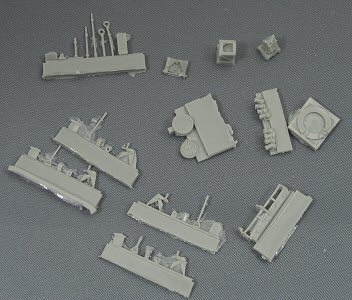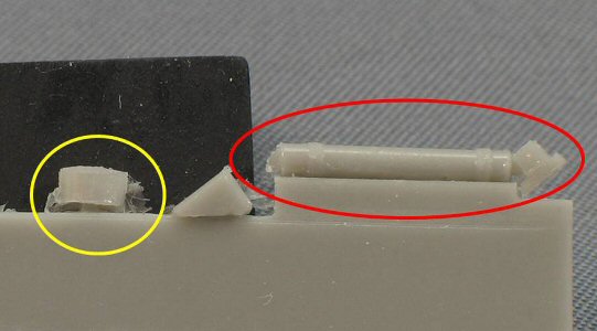 | Cutting resin parts from the pouring block and cleaning them up can sometimes a bit of a challenge, certainly when those parts are small and/or fragile. From a modeller's point of view, this means: the less contact with the pouring block, the better. However, from a manufactures point of view, more contact with the pouring block is better, because easier to cast with a higher success rate (meaning more profit) and less breakage during handling and transport. Therefore the mould maker often has to compromise. | ||
