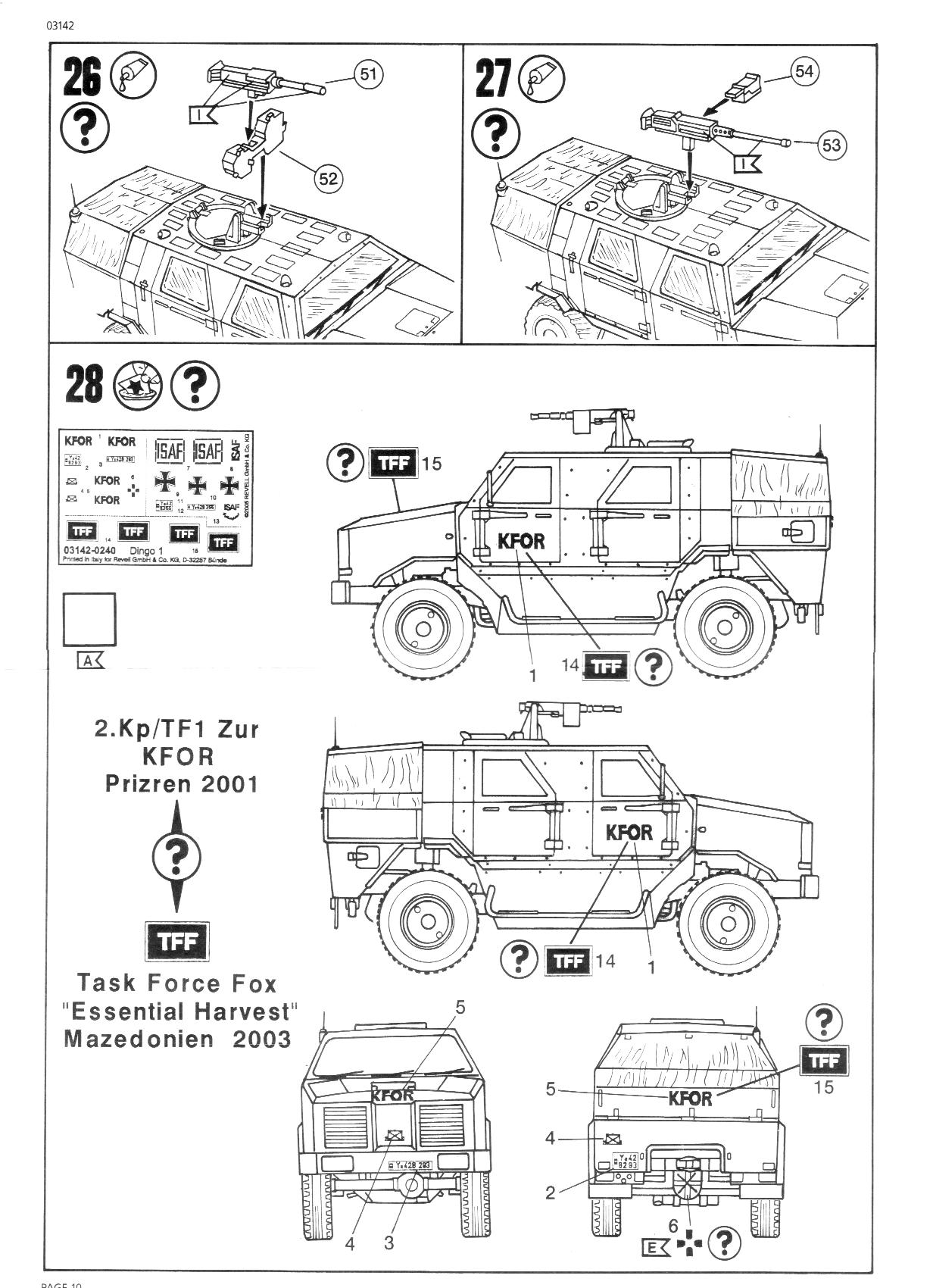 are given: I chose the Task Force Fox option for markings. The decals are not quite correct as presented on the decal sheet. The green TFF rectangles lack the narrow white border which I added by placing a slightly larger rectangle of white decal underneath the kit decal. Pictures of sister TFF Dingoes found at reference [1] show that there should also be German flag markings for the front bumper and on the right rear body panel. I made these from scratch, cobbling together other decal pieces to make the flags. This was quite easy to do since the flag consists of just three horizontal bars of black, red and yellow moving from top to bottom. I also made one additional flag which was attached to a piece of guitar wire used for an antenna and then attached it to the antenna mount at the rear of the vehicle. On the whole, this kit is quite easy to build. For me it took quite a bit longer to finish than my other armour builds, not because it was difficult, but because I wasn't thinking too clearly when I first bought the kit. Arriving at the point where I had to mask the windows I came to realize why I had returned to armour modelling. I was suffering from a form of “masking phobia” brought about by my latest aircraft projects. A return to armour modelling looked like it might be the cure, where masking for the most part is limited. Unfortunately I wasn’t quite cured of my phobia so this kit sat for a few weeks until I finally forced myself to get on with the masking and finish painting and building the kit. References Review sample purchased by the author. |
