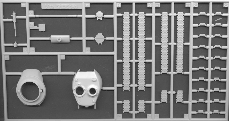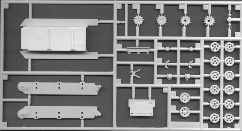 Although the model is actually very well molded with adequate detail, and no flash or sinkmarks, it is a highly inaccurate kit. The dimensions are totally screwed up (according to Hunnicutt's Sherman - A History of the American Medium Tank). The hull scales out close to 1/76th, while some of the parts are much larger. The wheels for example actually scale out to 1/70th.