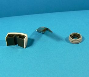 The commanders cupola also needs some attention. It sits too low and the hatch opens the wrong way. I cut the top off, moved it 36 degrees and glued back in place. A washer was added underneath - all three parts can be seen on upper picture and the result is on lower picture. A hatch stop and a catch holding it in open position was made from scrap PE.