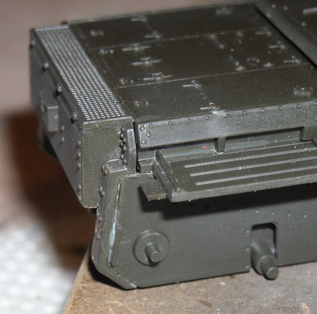 All parts have very nice detail, even the underside of the hull, and most of them are fool-proof due to intelligent pegs, like the wheel halves that ensure the alignment between the inner and outer row of spokes. Well, at least most are fool-proof, as I managed to glue part (2) in the wrong place, remember... One design choice that I didn't understand is found in assembly step 12. Fender ribbing is absent where the toolboxes are to come, except for the frontmost box on the right fender. Is this box optional ? I don't know, but it causes a worse fit than necessary where the ribbing is present. (Yes, I could have sanded the ribbing off, but at this point I was still sticking to my OOB plan.) The turret goes together very nicely,