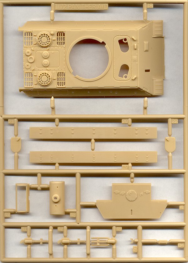 This is the sprue included with the Panther D/A kit. Two types of exhaust pipes are included, the single pipes for the Ausf. D, and the triple left-side pipe for the Ausf. A. Also shown is the flap cover for the hull machine gun on the Ausf. D. The ball mount cover for the Ausf. A and G is included on another sprue. The hull details are very well done, with outstanding relief to the hinges, handles and panels. One interesting oversight though: the circular cooling exhaust grills are not correct. There is a spiral pattern to the framework in the grills (which is actually spiralling in the wrong direction) which was only seen on the Ausf. D. The grills on the Ausf. A did not have the spiral pattern; instead the frames radiated straight outward from the center. The handles on the driver's and radio operator's hatches need to be relocated to the center of the hatches for the Ausf. D. One area where the ESCI Panther beats this kit is the shape of the hull sides. The notched area towards the rear of the hull is shaped incorrectly on this kit, and looks much better on the ESCI kit.