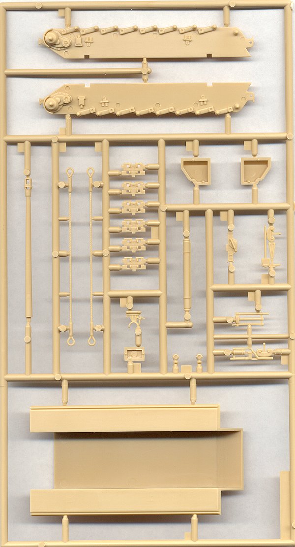 The next sprue contains the lower hull, chassis parts and pioneer tools. Take note on how the wheels are attached. The axles are on a backing plate separate from the lower hull, so the modeler can paint and assemble the wheels and tracks prior to attaching them to the hull. This is a very nice feature, and I can attest to the benefits of this particular design. The gun barrel is nice and straight, and the spare track links are useable too. The pioneer tools are only slightly better than being molded onto the hull, and best replaced.