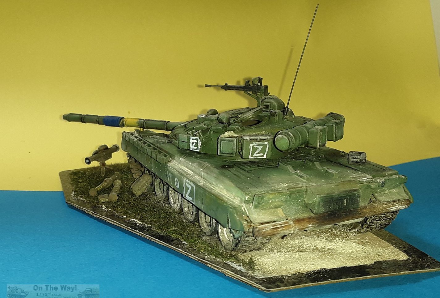 it ran out of fuel, as represented by the open gas caps and fuel jerrycan on the fender. Ukrainian colors have been hastily painted on the gun barrel to curb friendly fire.